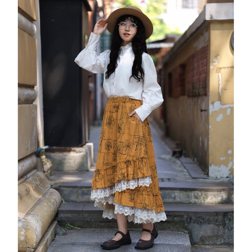 セミロリ コーデュロイ ミドル丈 スカート 森ガール風 フリル レイヤード レトロロリィタ
