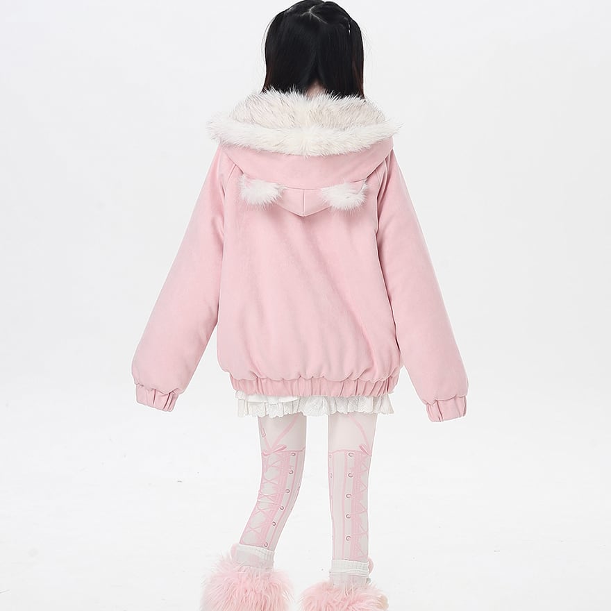 フードに愛らしい猫耳をあしらい、ふわふわのファー裏地がたまらない、甘くてガーリーなブルゾンです。