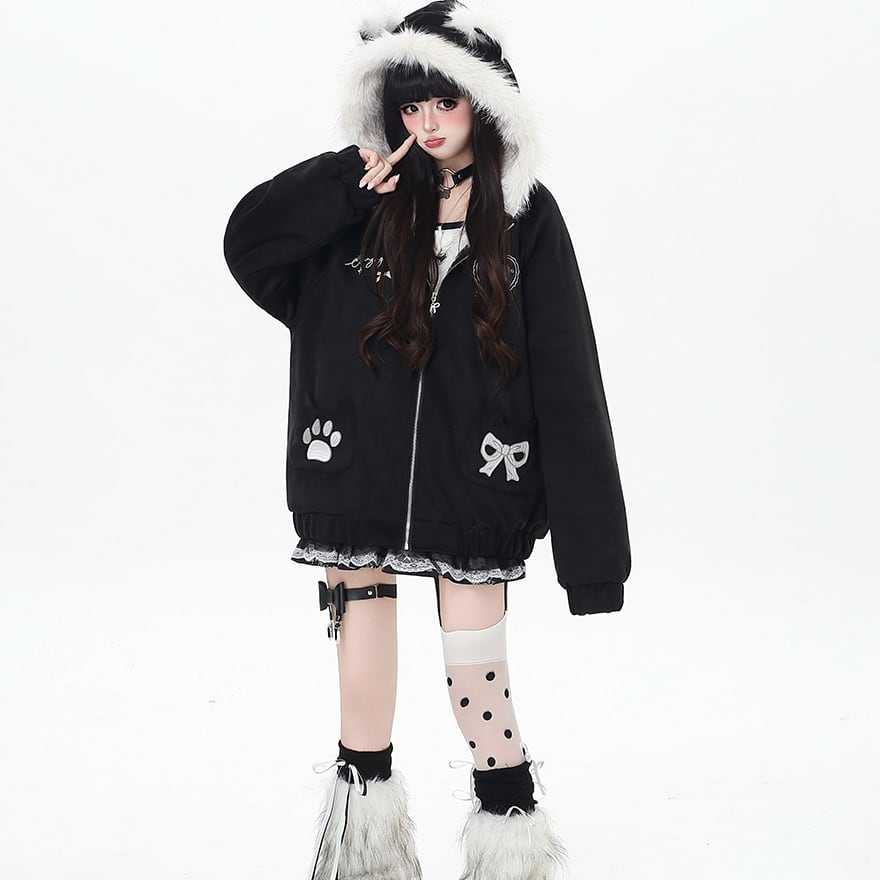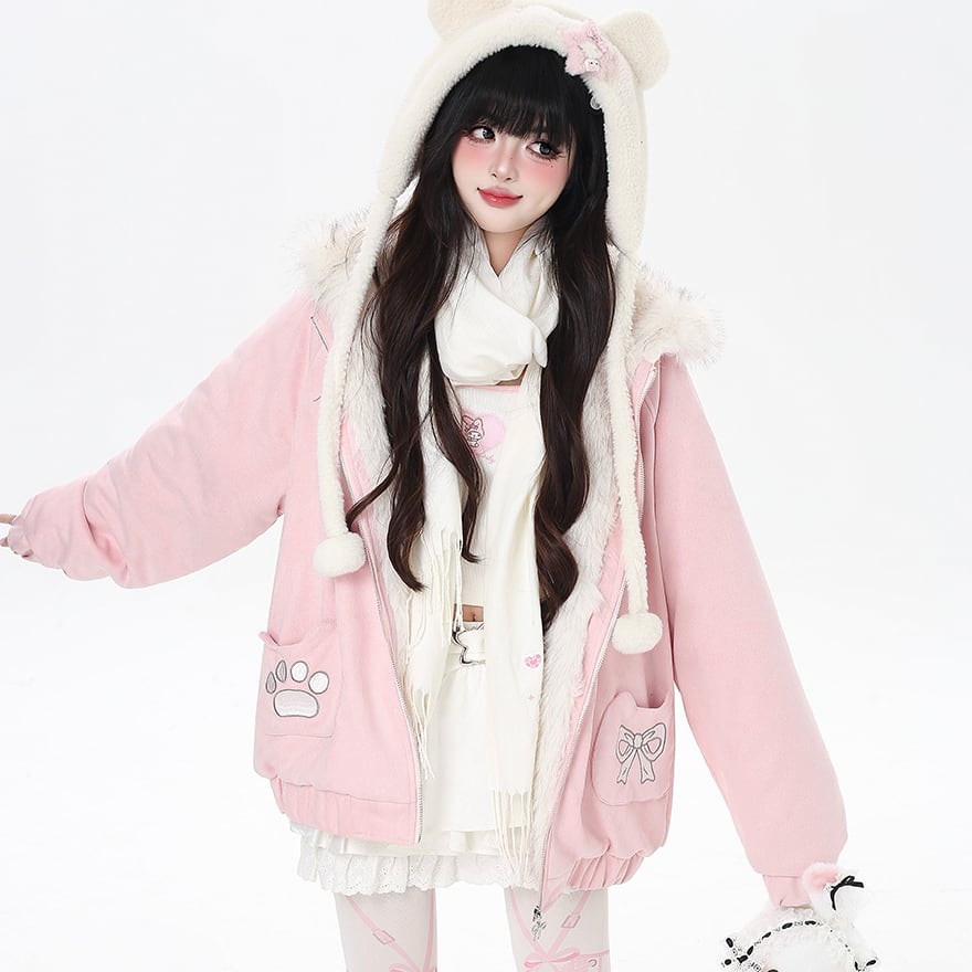 フード周りから前立てにかけて施されたボリュームたっぷりのファーと、内側全体に敷き詰められた柔らかなボア素材が、真冬でも暖かく包み込んでくれます。ルーズなシルエットで、厚手のロリィタブラウスの上にも羽織りやすく、甘めから地雷系まで幅広いスタイルに合わせやすい万能アウターです。袖口や裾のリブ部分にもファーが覗き、どこから見ても愛らしい「あざと可愛い」スタイルを叶えます。