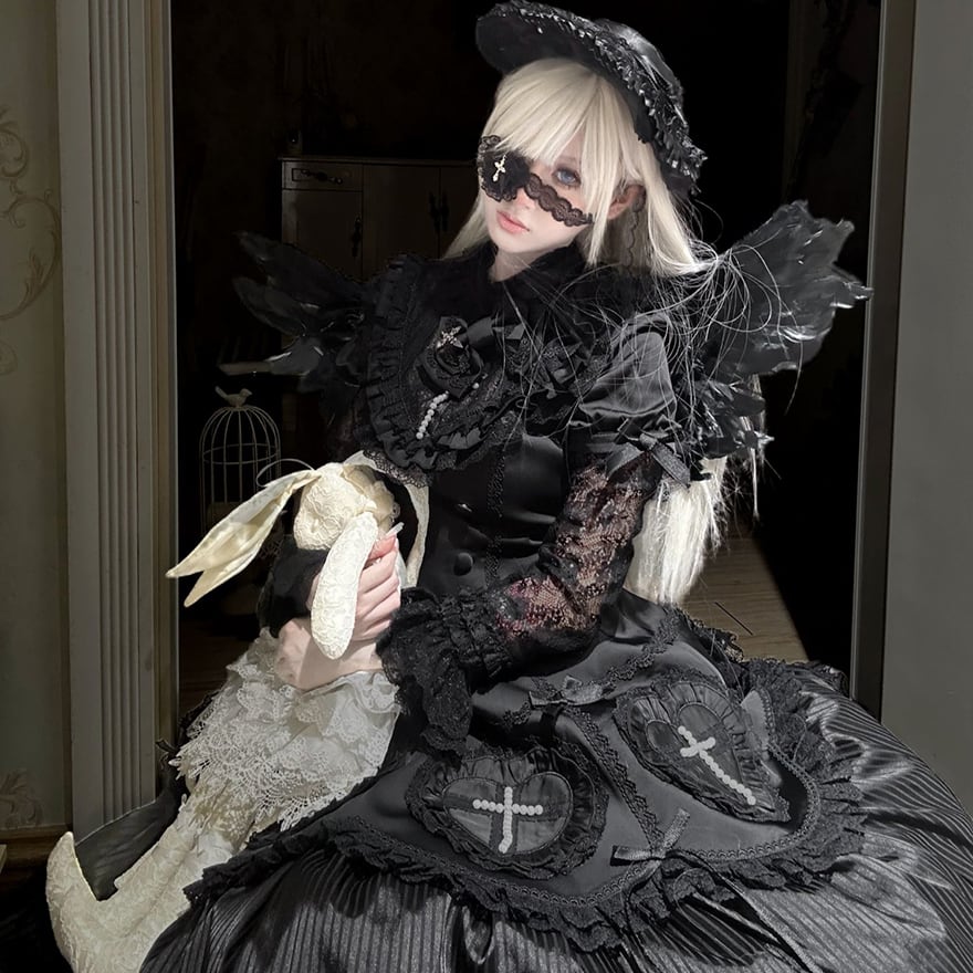 ゴシックロリィタ ゴスロリ ロリィタワンピース 十字架 ハートモチーフ ドール服 黒ロリィタ 撮影会 イベント衣装 世界観コーデ