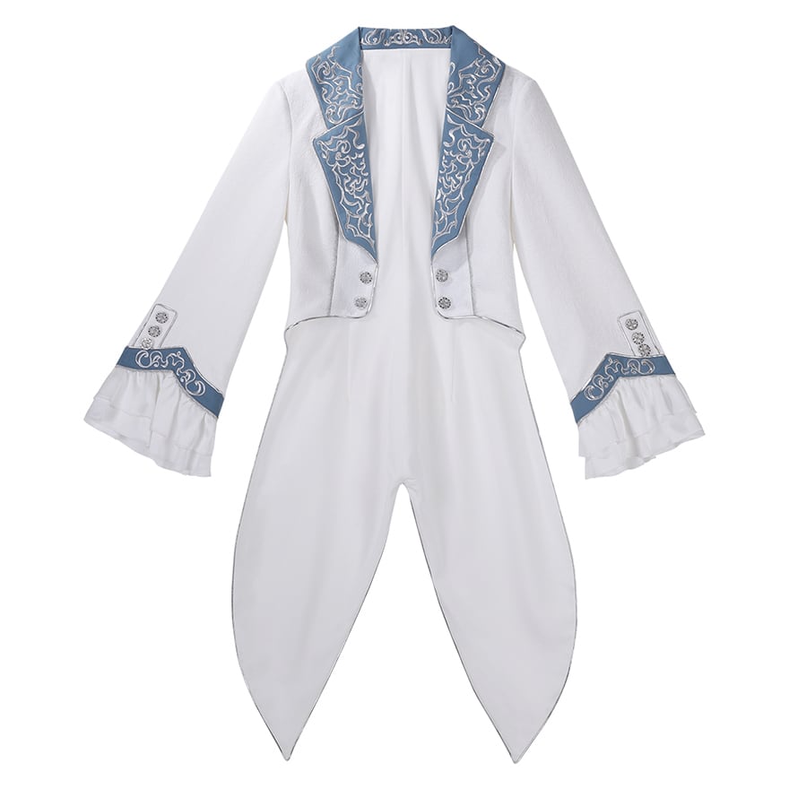 燕尾服のように長く伸びたジャケットの裾や、繊細な刺繍があしらわれたラペル、そして袖口から広がる優雅なフリルが、気品あふれる麗しいシルエットを演出します。