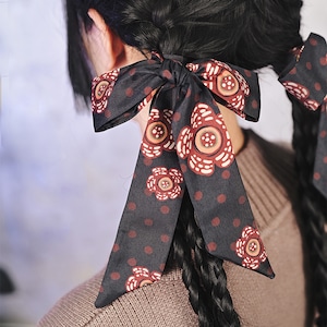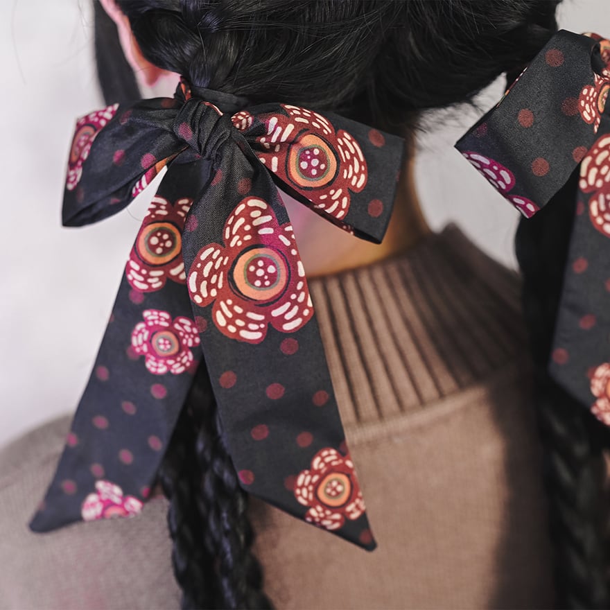幅約4cm、長さ約100cmの細長いスカーフ状で作られており、ヘアアクセサリーとしてはもちろん、首元のアクセントとしても使用できる万能アイテムです。