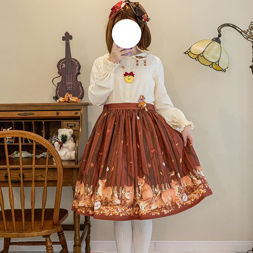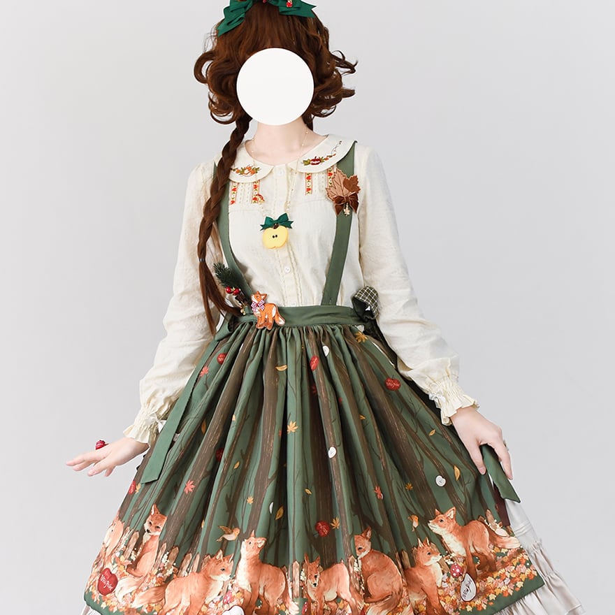 丸襟にはキツネやリンゴなど、森を連想させるモチーフが繊細に描かれ、胸元のピンタックとレースが英国カントリー風の上品さを演出します。