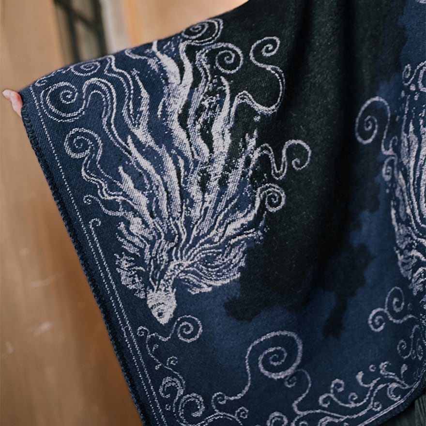 夜の海を思わせる深いブラックと藍色をベースに、長く美しいヒレを持つ魚や波紋の模様が大胆かつ繊細に描かれた大判ショールです。