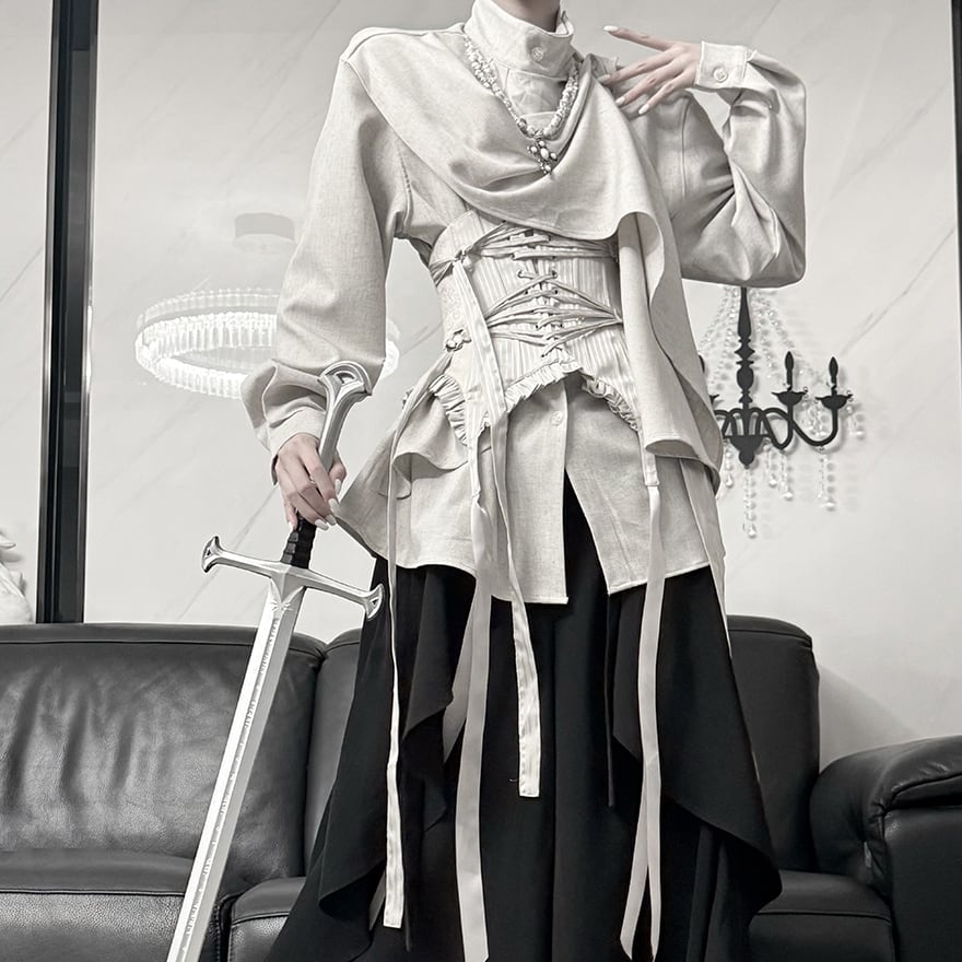関連キーワード: #男装 #ユニセックス #モード系 #ゴシック #サブカル #変形シャツ #スタンドカラー #レイヤード #コンカフェ #衣装