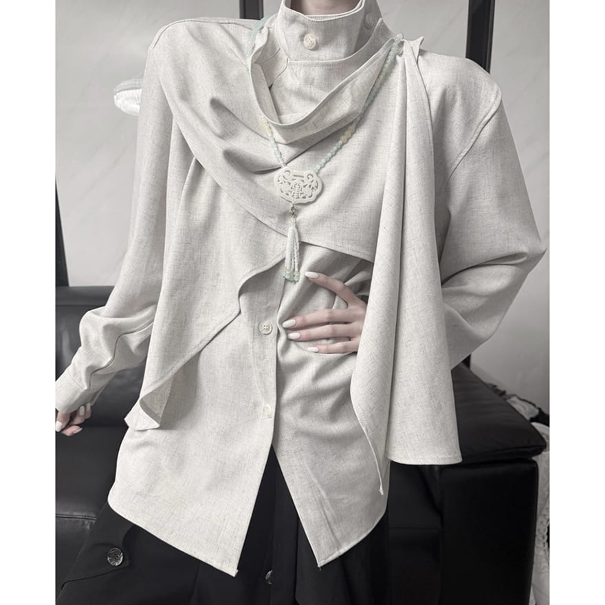 首元を凛と見せるスタンドカラーに、ストールを纏ったような複雑なレイヤードデザインが施された変形シャツです。