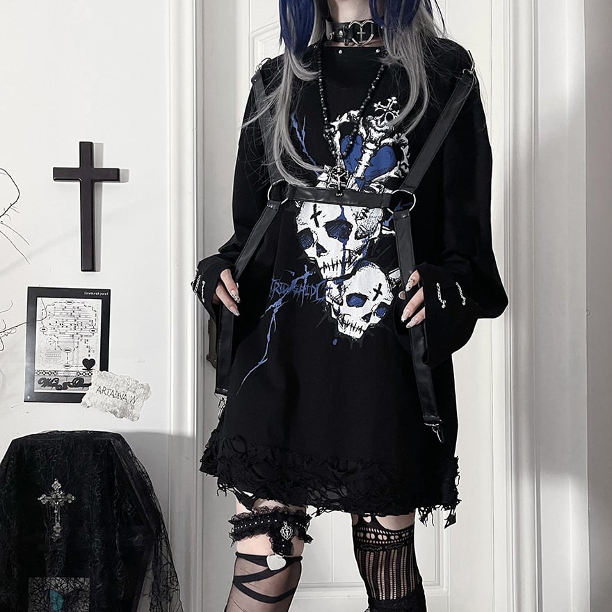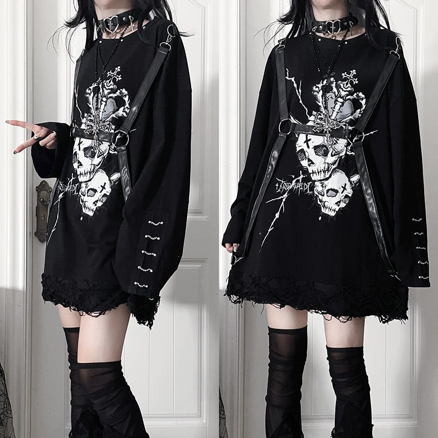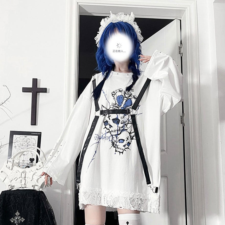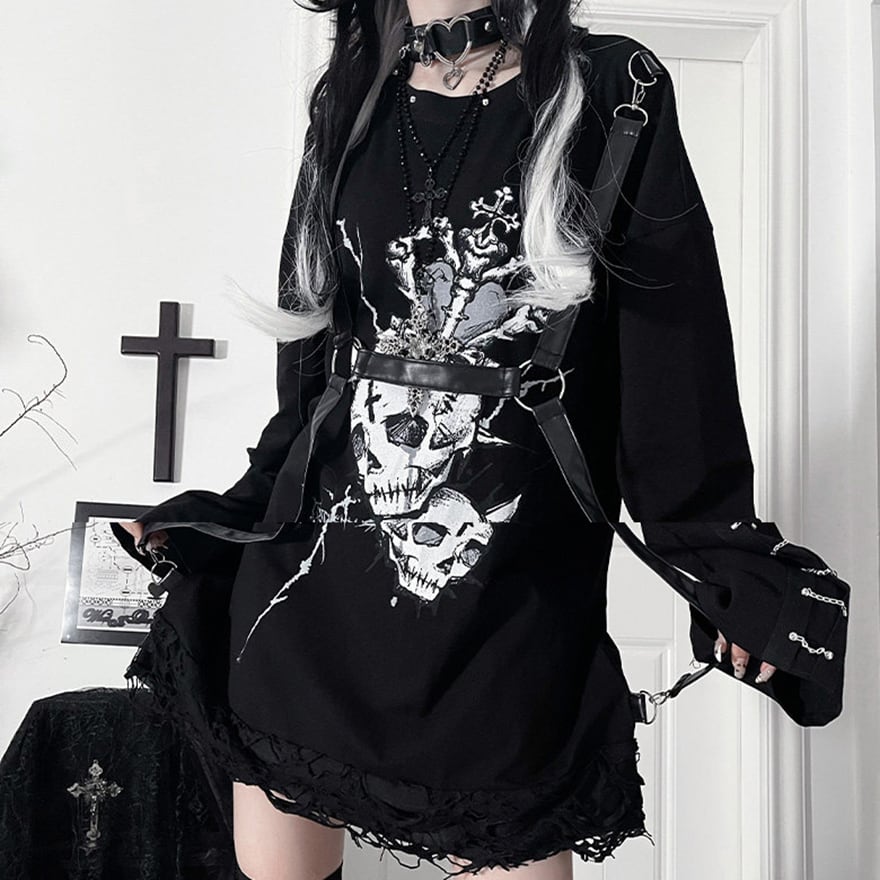 パンク 推し活 ライブ 長袖 Tシャツ スカル プリント Y2Kファッション