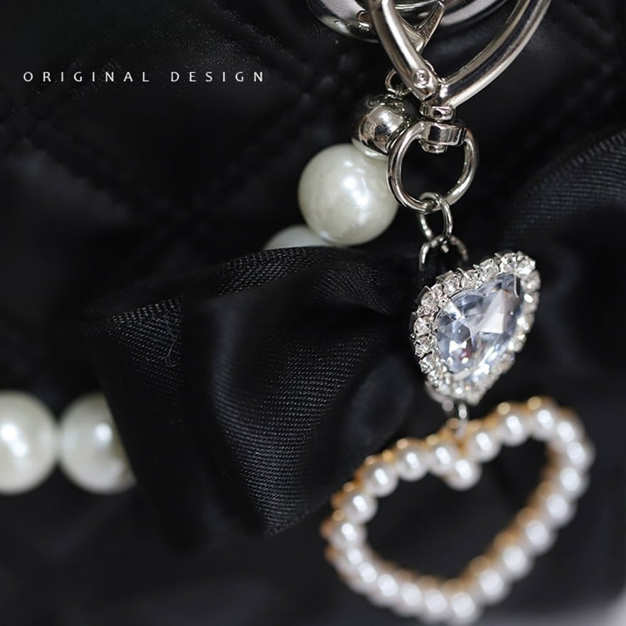 特筆すべきは、付属のチャームです。大きな黒いリボン、パールを連ねたチェーン、そしてラインストーンとパールで装飾されたハートのモチーフが、バッグにドーリーで華やかな魅力を添えています。