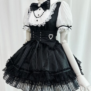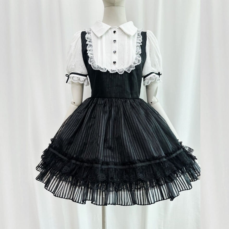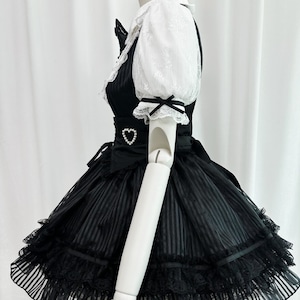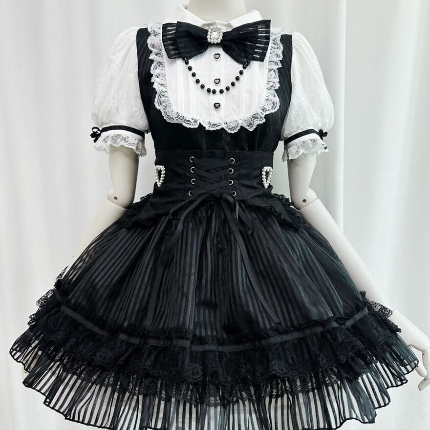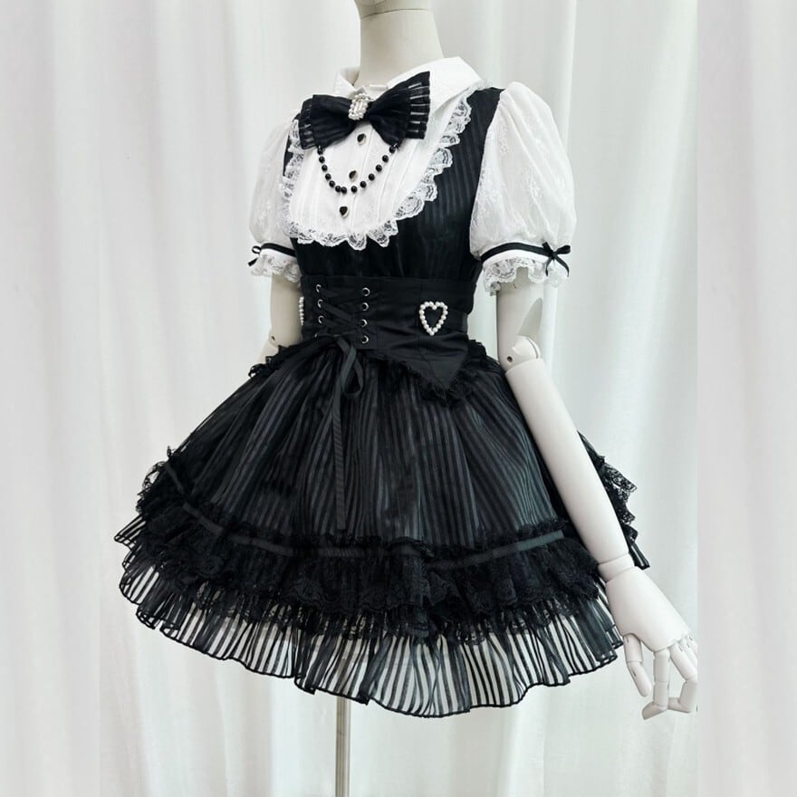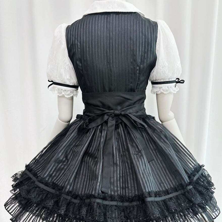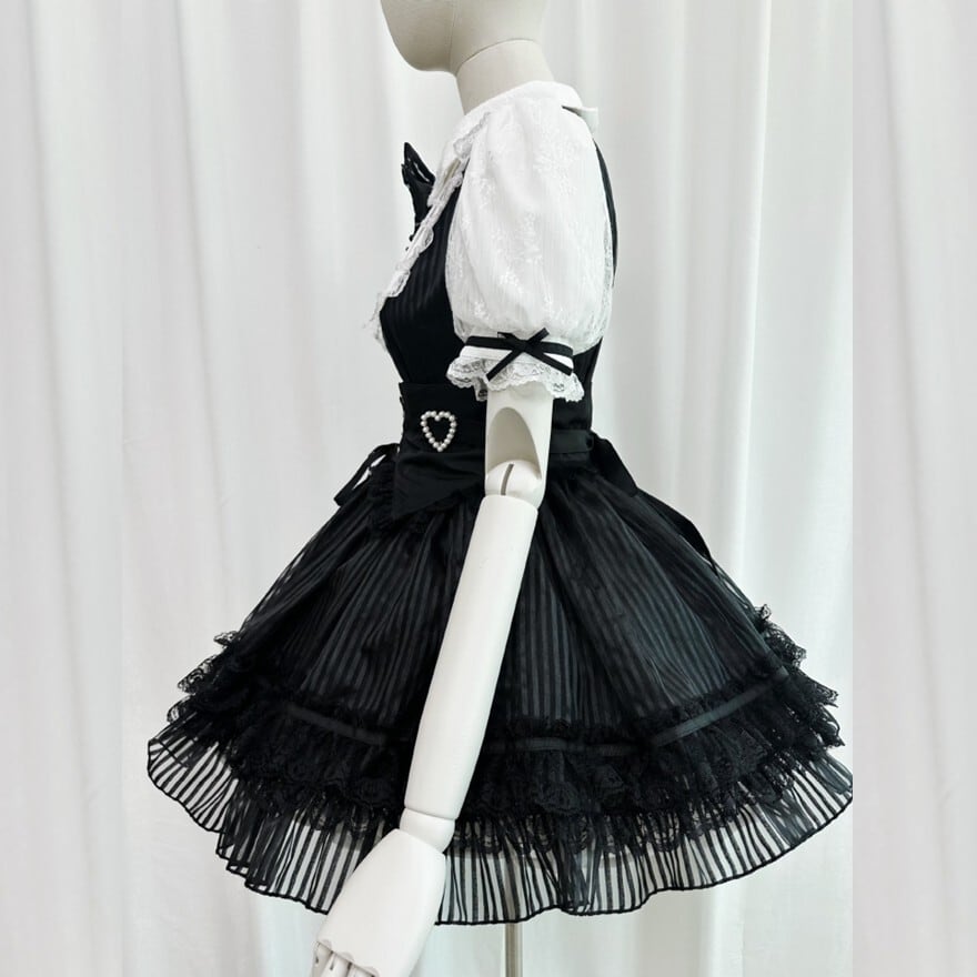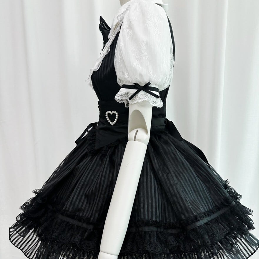 オフホワイトのパフスリーブブラウスと、ブラックのストライプ柄スカートが一体となった、クラシカルロリータのワンピースです。
