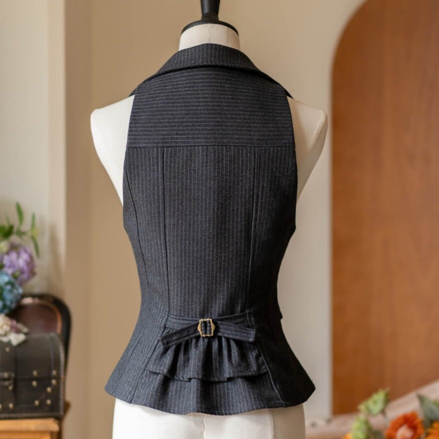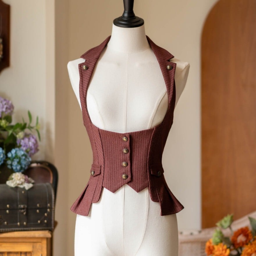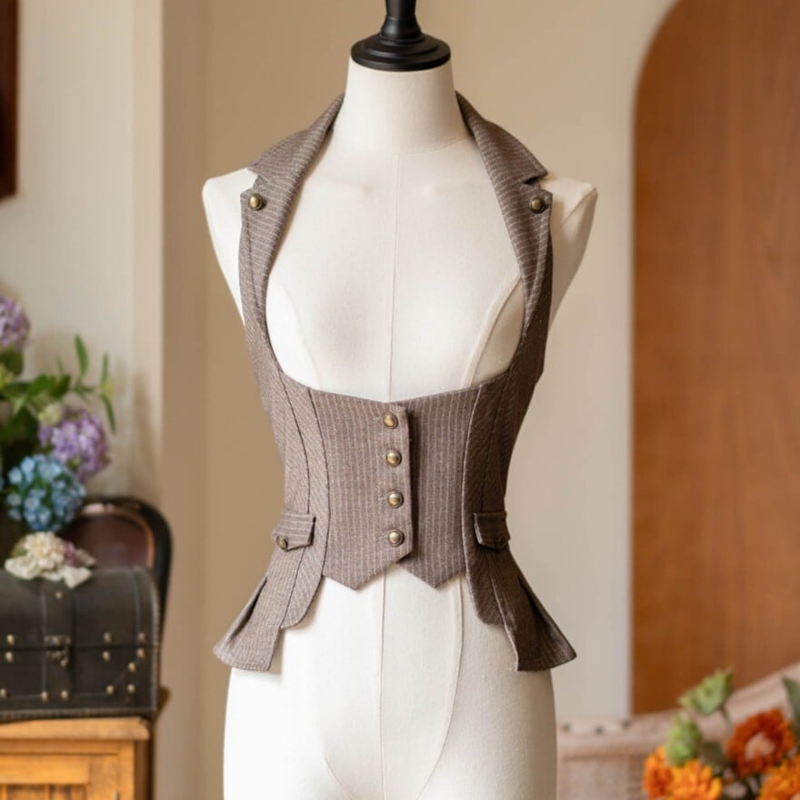 コルセット風のデザインがウエストを美しく見せる、クラシカルなビスチェベストです。