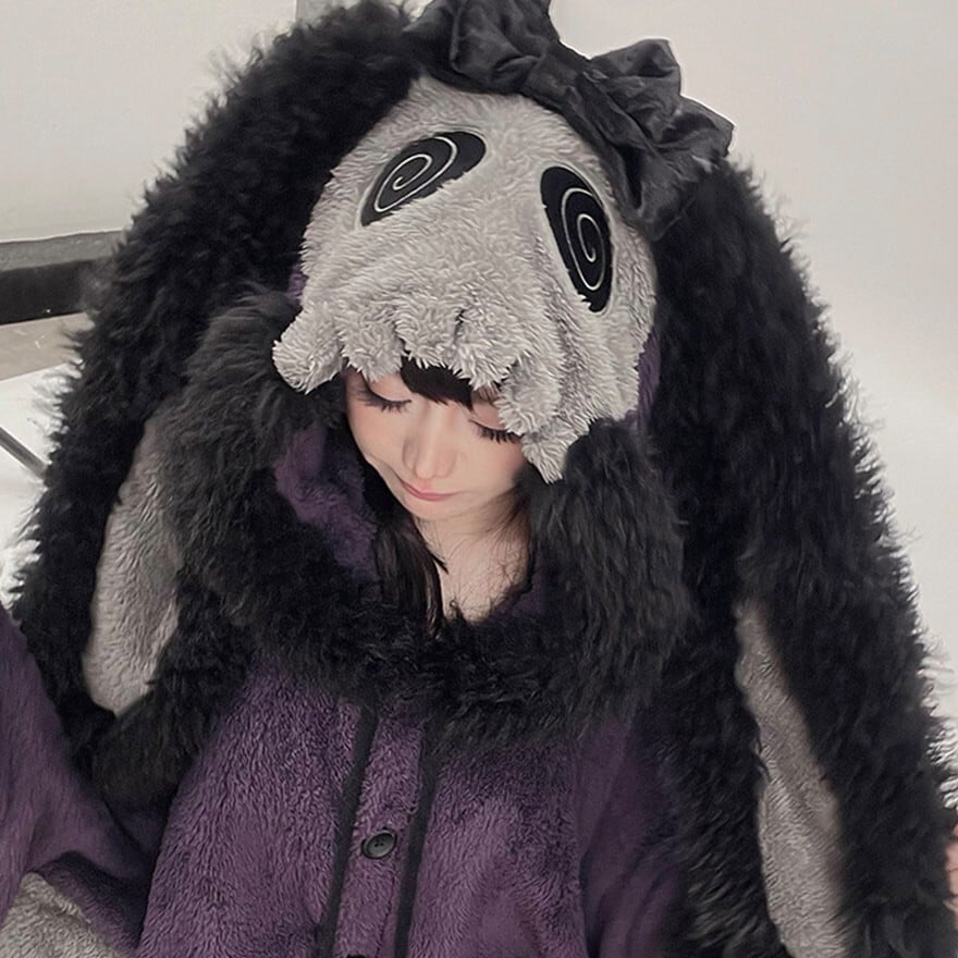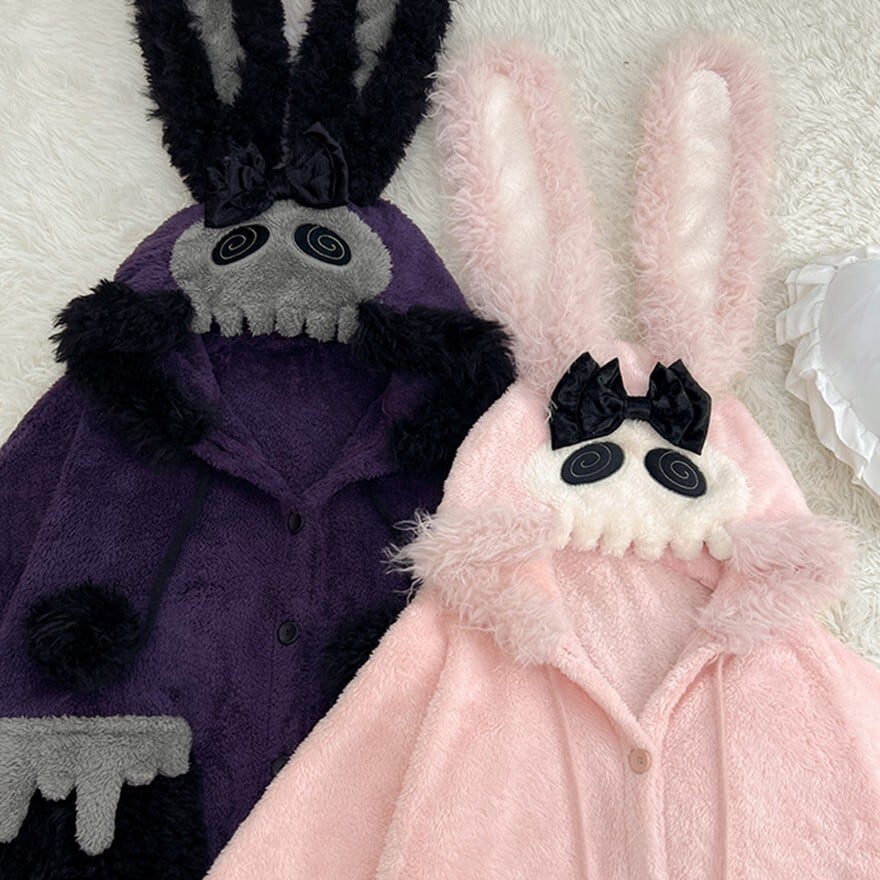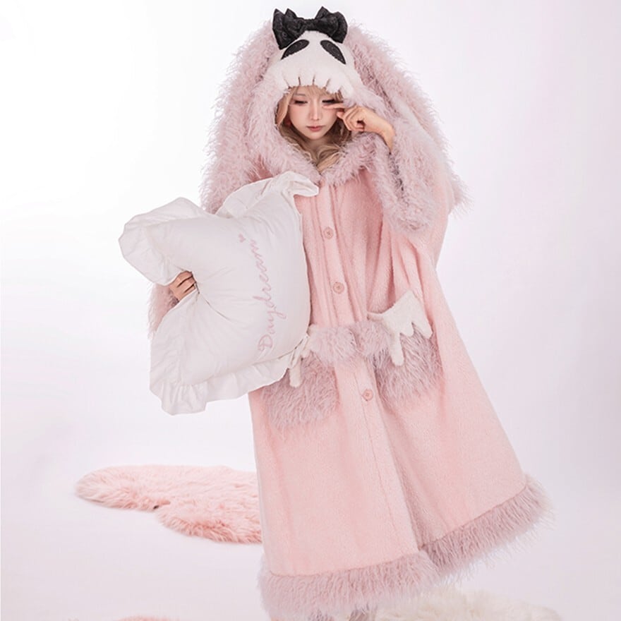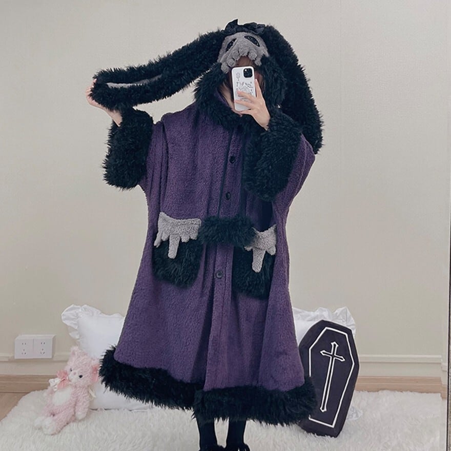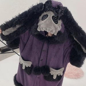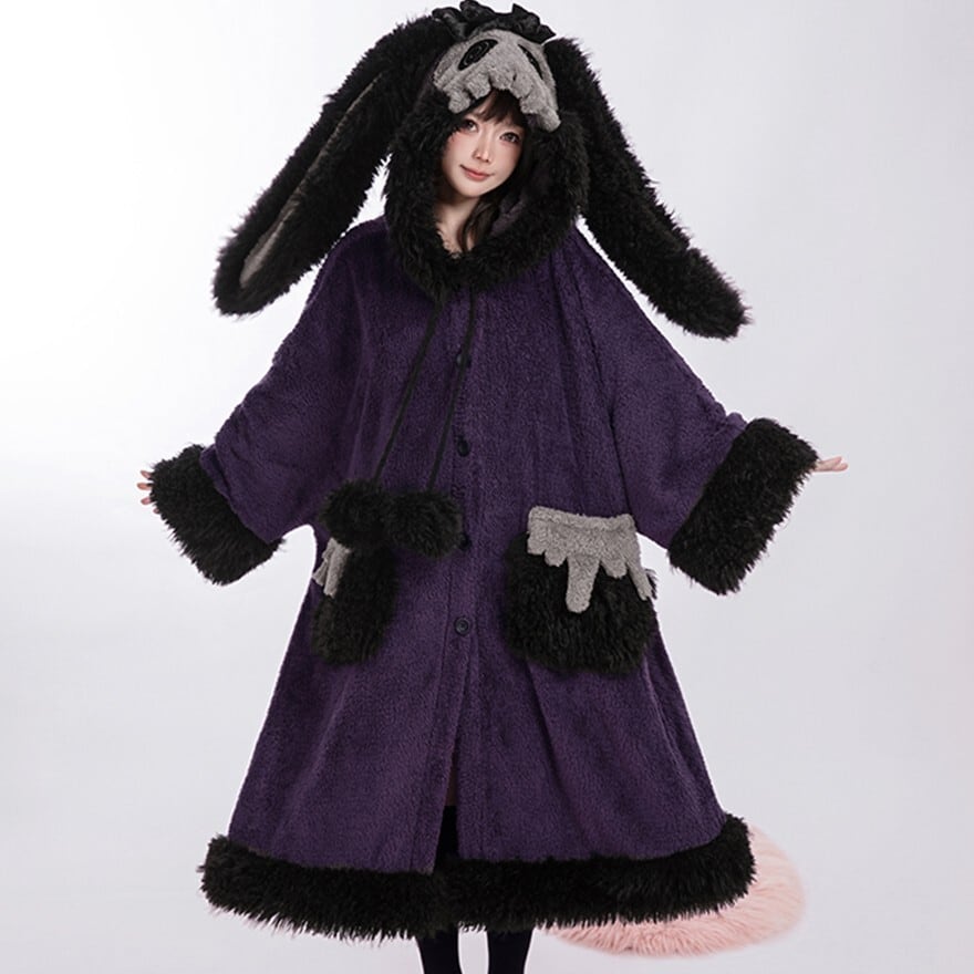まるでぬいぐるみのようなふわふわもこもこの手触りで、見た目にも着心地にも癒やしと暖かさを与えてくれるコートです。長いウサギ耳とファーが、どこにいても注目の的となること間違いなし!
