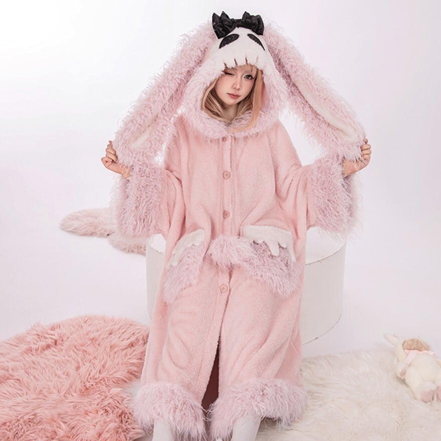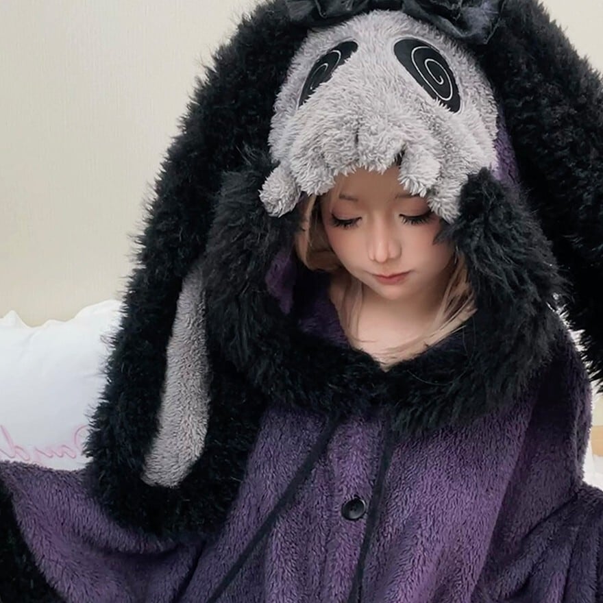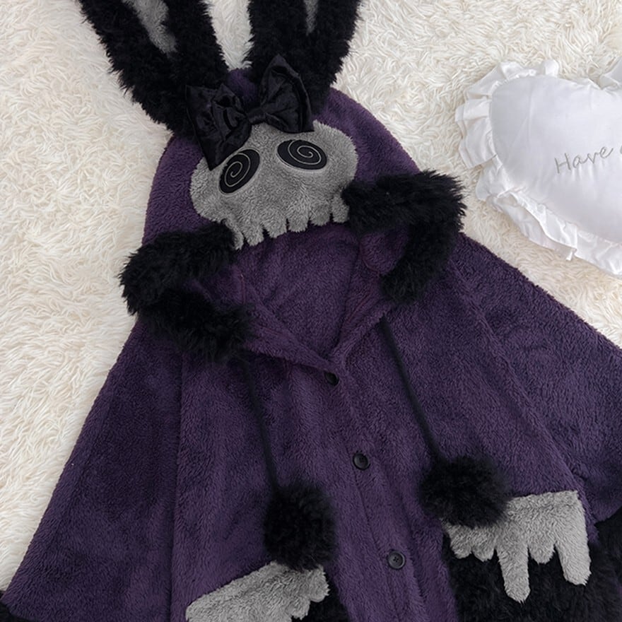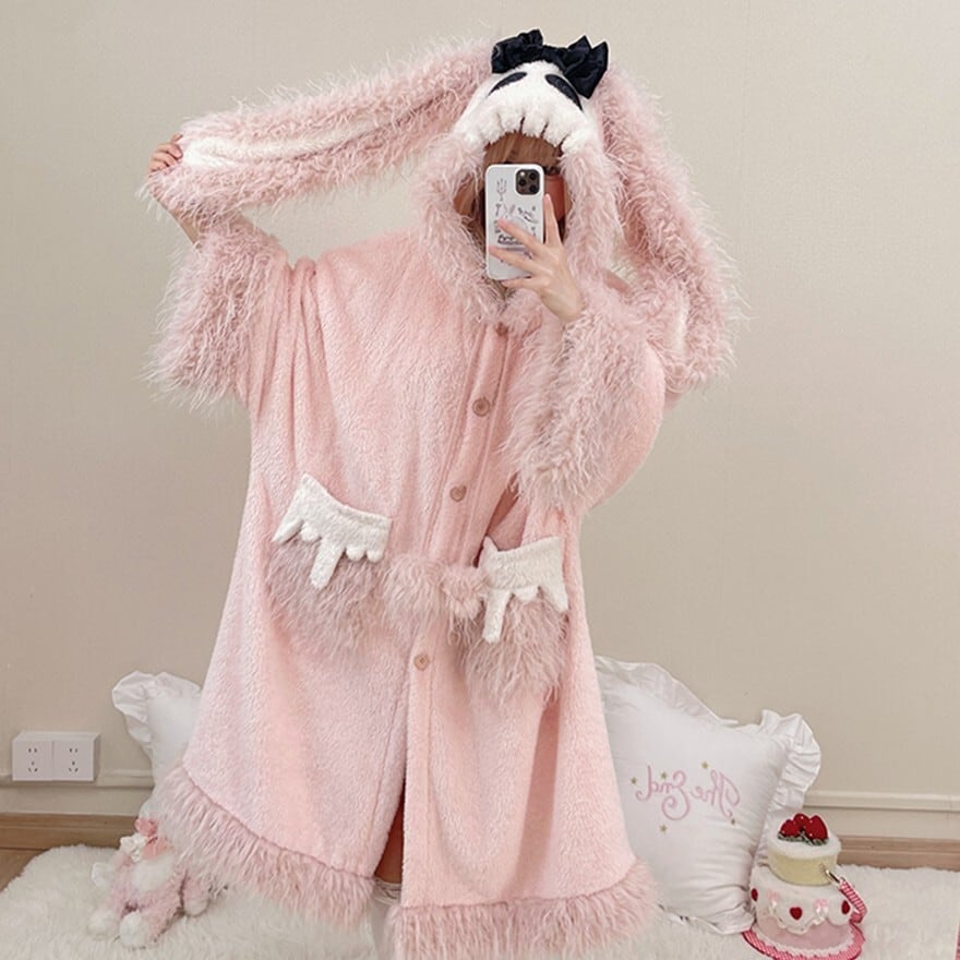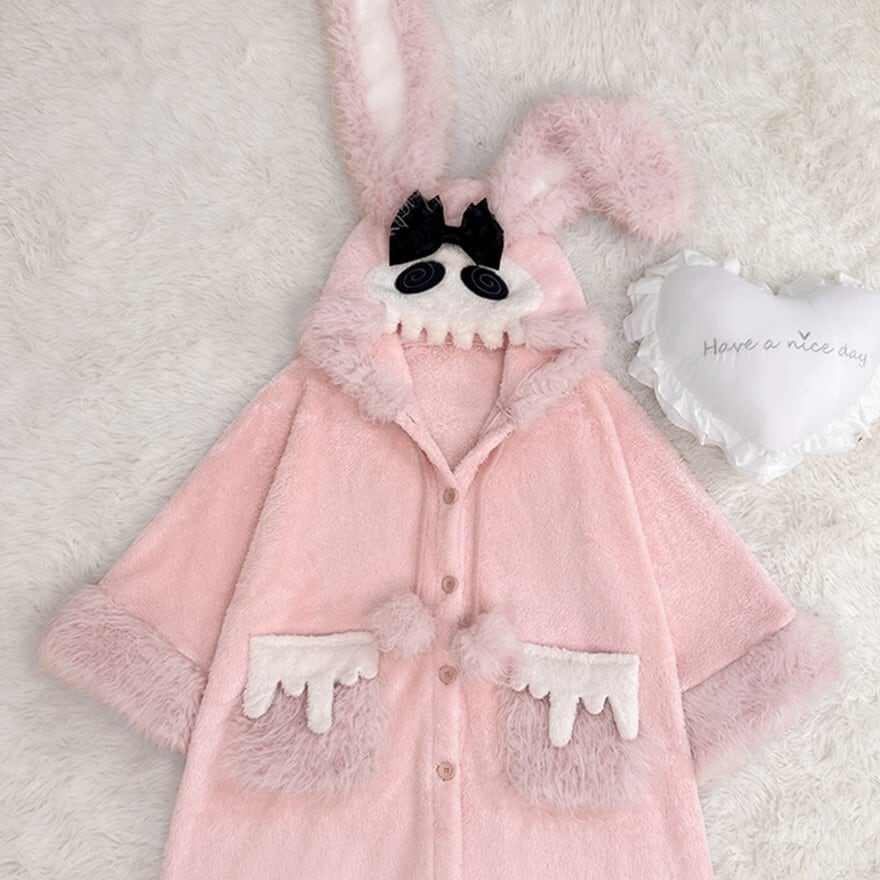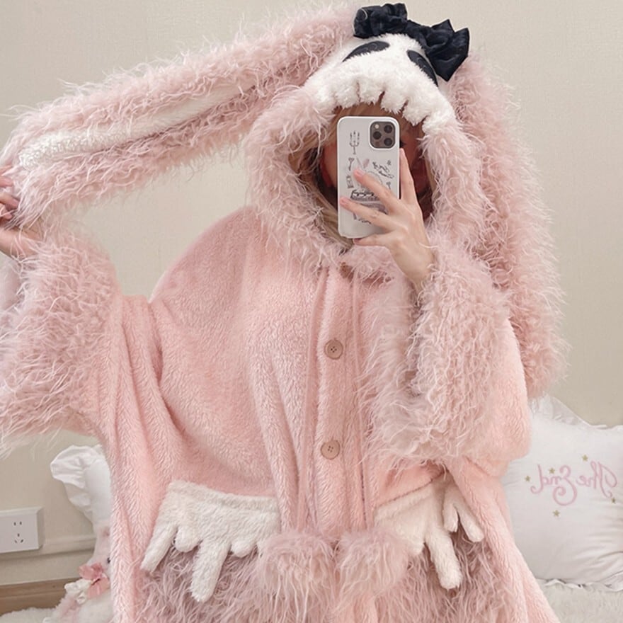 まるでぬいぐるみのようなふわふわもこもこの手触りで、見た目にも着心地にも癒やしと暖かさを与えてくれるコートです。長いウサギ耳とファーが、どこにいても注目の的となること間違いなし!