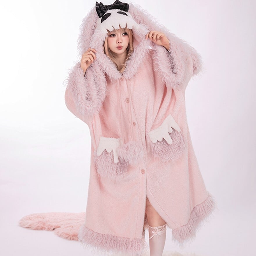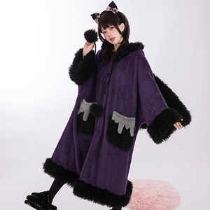 袖口や裾にはふわふわの長毛ファーがあしらわれ、暖かさとロリータらしい愛らしさを演出。個性的なデザインのポケットもアクセントになっています。背中には取り外し可能な可愛いしっぽも付いています。