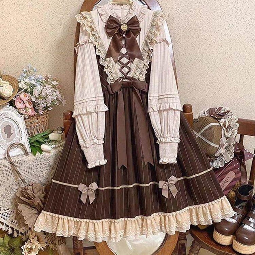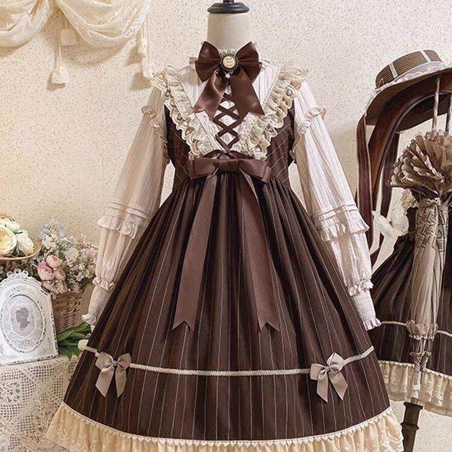 レトロクラシカル ワンピース レースアップリボン |アンティークブラウン