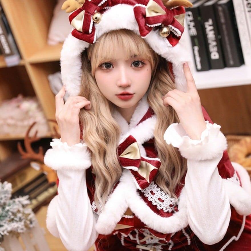 【ケープ】 フード付きのショートケープは、全体に白いファーがあしらわれ、暖かさとロリータらしい愛らしさをプラス。トナカイの角と鈴が付いたリボン飾りが、クリスマス気分を盛り上げます。