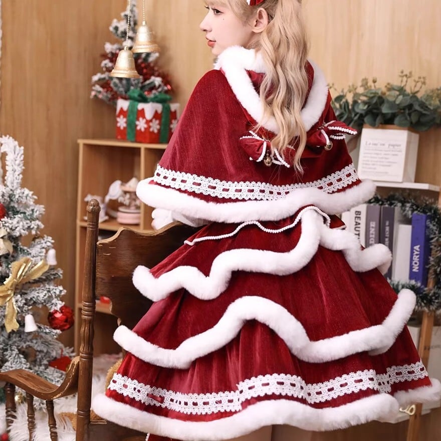 華やかな赤のベルベット生地と、雪のような白いファーをたっぷり使用した、ワンピース、トップス、ケープの豪華3点セットです。