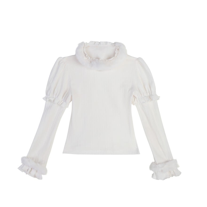 【トップス】 真っ白な長袖トップスは、ハイネックと袖口に白いファーを施し、暖かさと可愛らしさを両立。JSKの下に着用することで、一気に冬らしい装いになります。