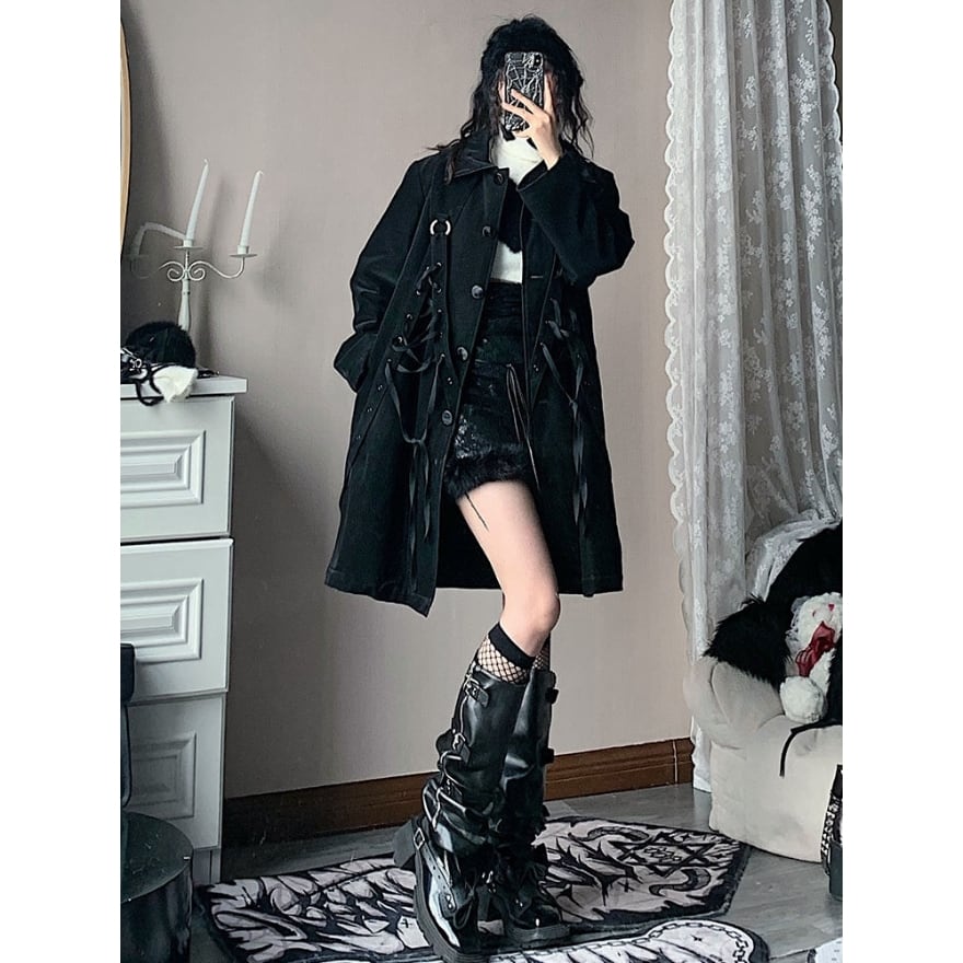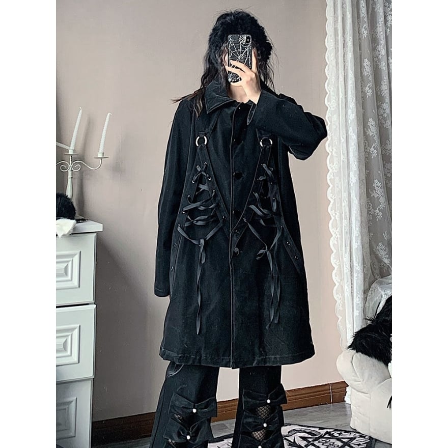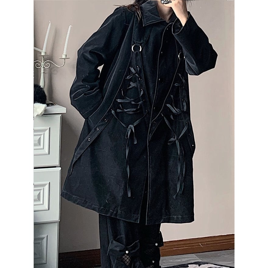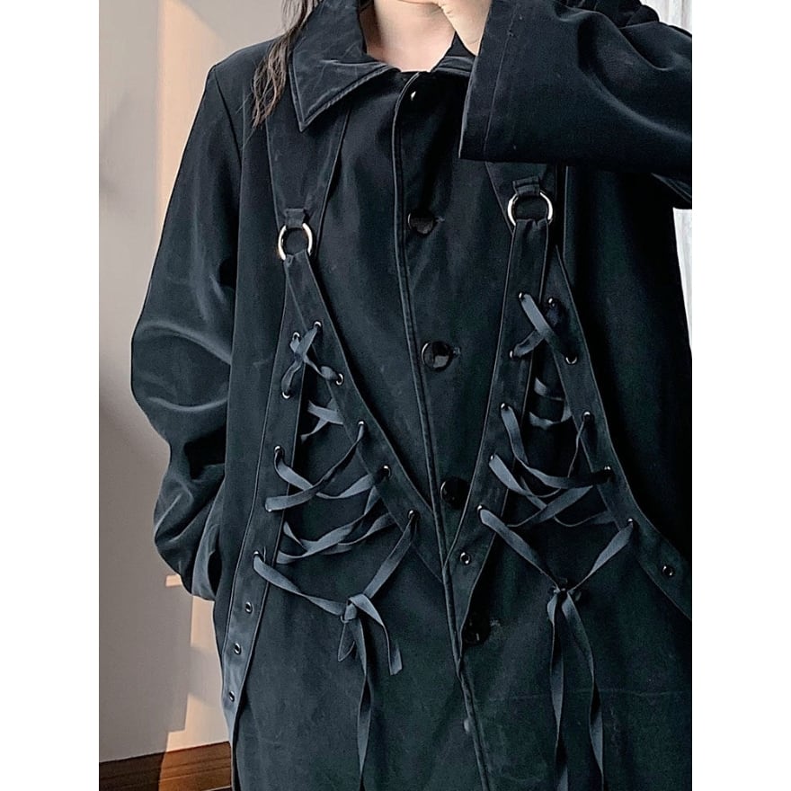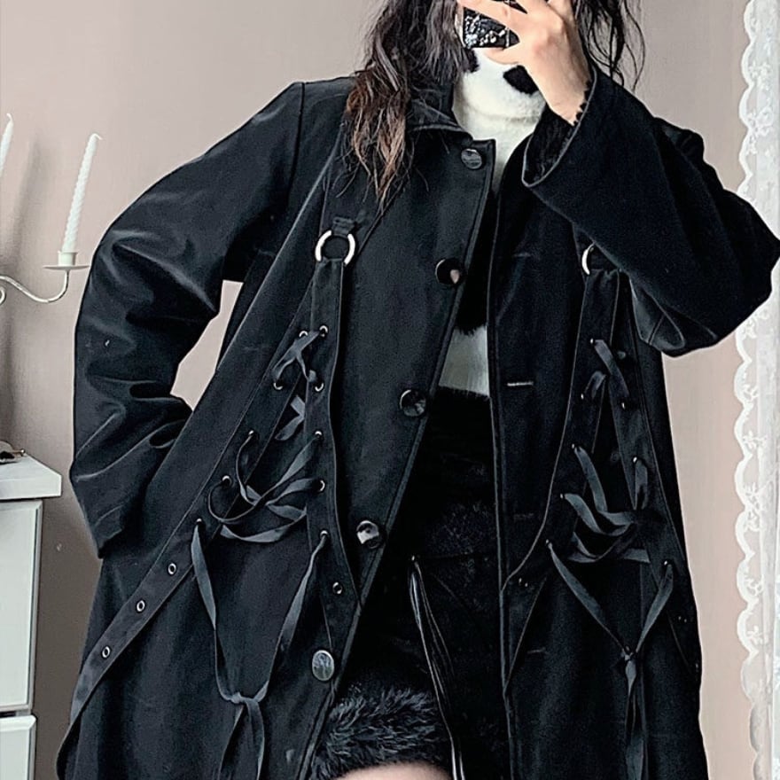 ハーネス風レースアップ装飾:両サイドの編み上げが視線を集め、シンプルな黒コートでも“攻め”のゴシック感を演出。