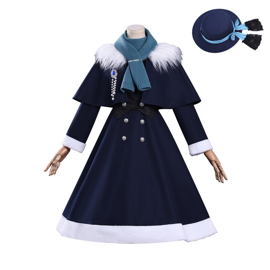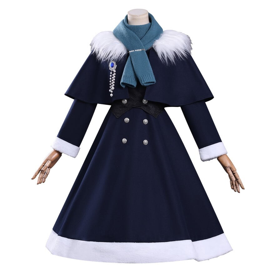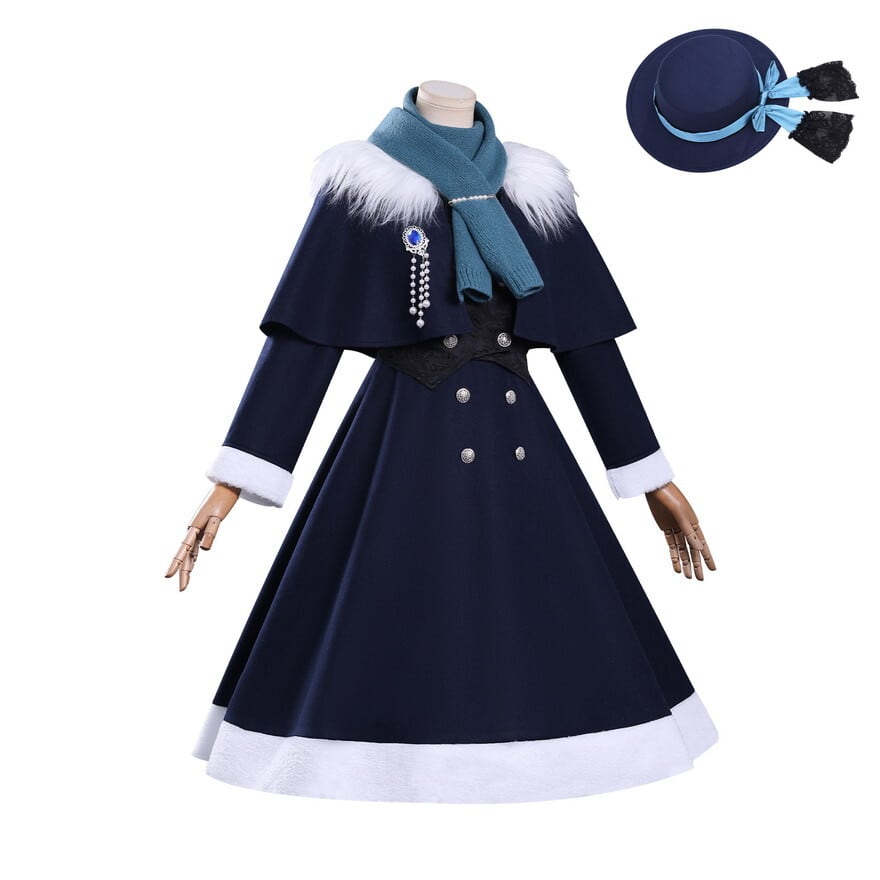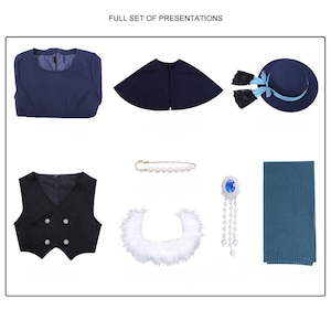 8点セット内容: コート風ワンピース、ケープ(取り外し可能)、帽子、マフラー、ファー襟、パールブローチ、ビジューブローチ、ベストが全てセットに