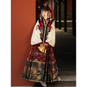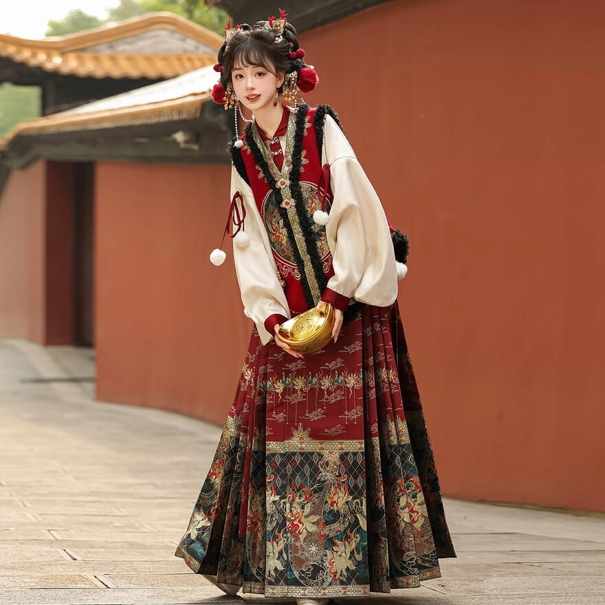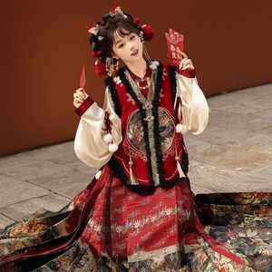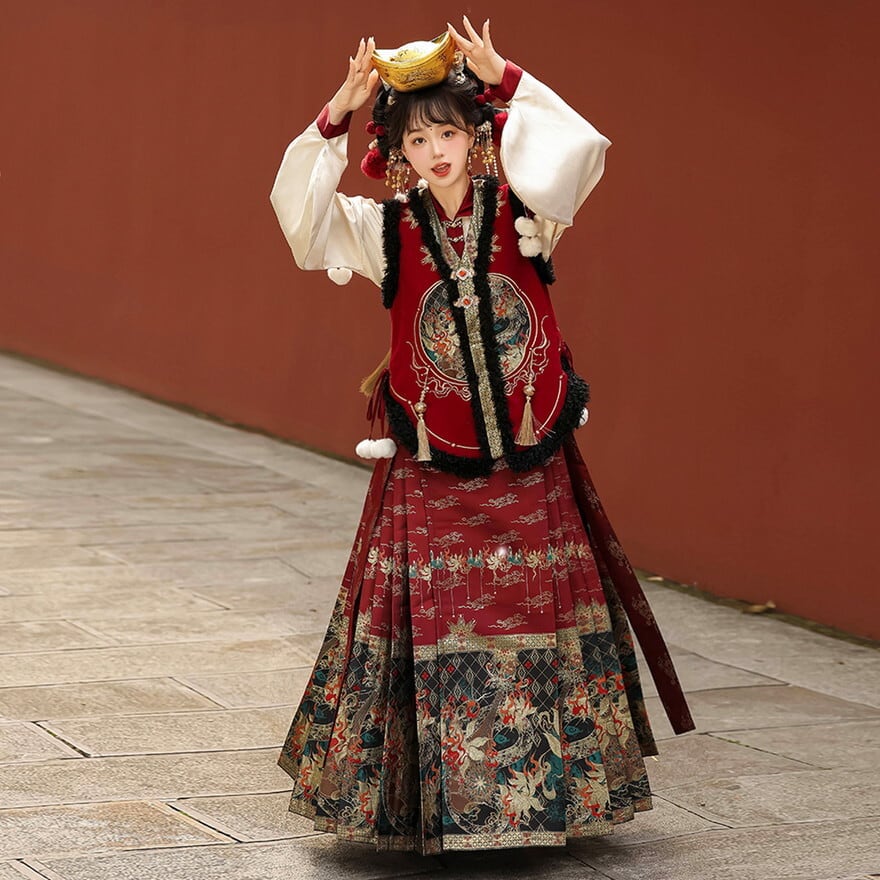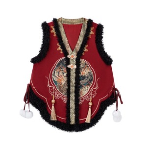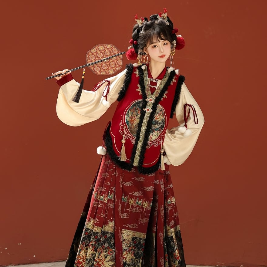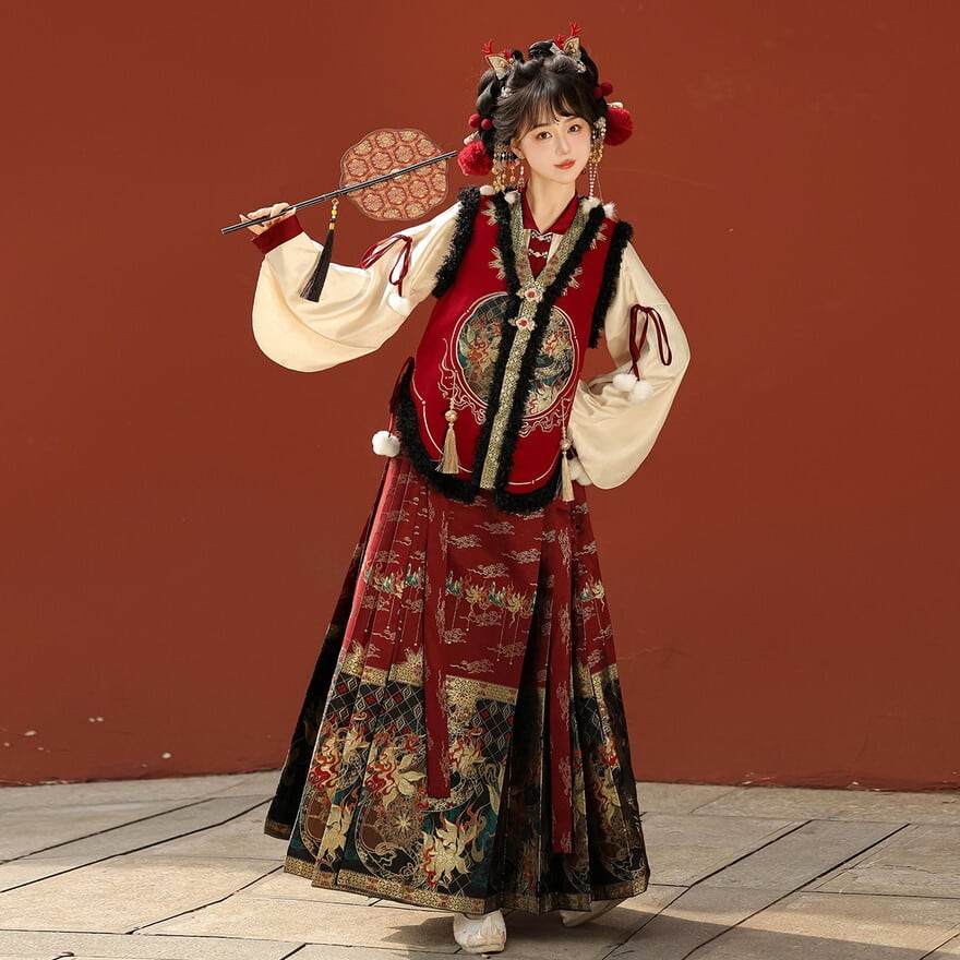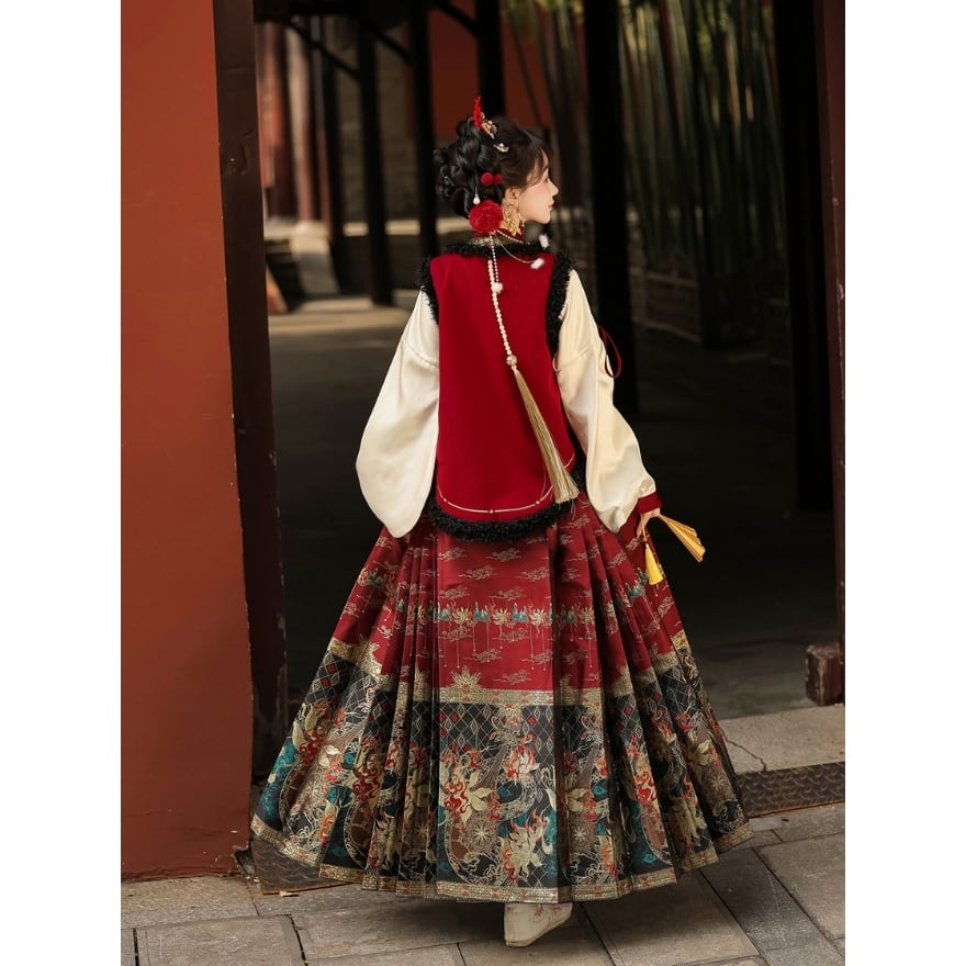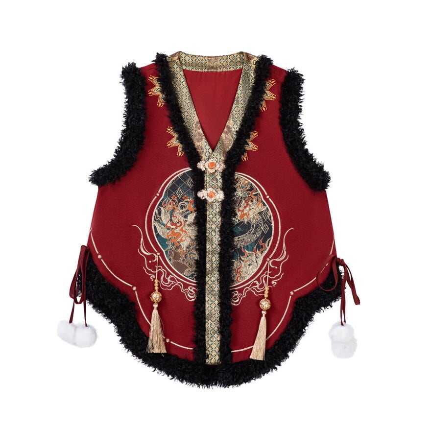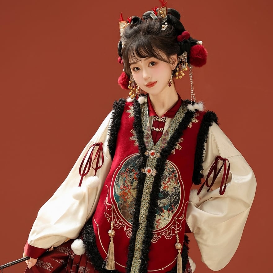 豪華なベスト: メインのワインレッドに、縁取りの黒いファーと金色の刺繍が施されたベスト。Vネックで、インナーのブラウスや漢服風トップス(別売り)との相性も抜群です。