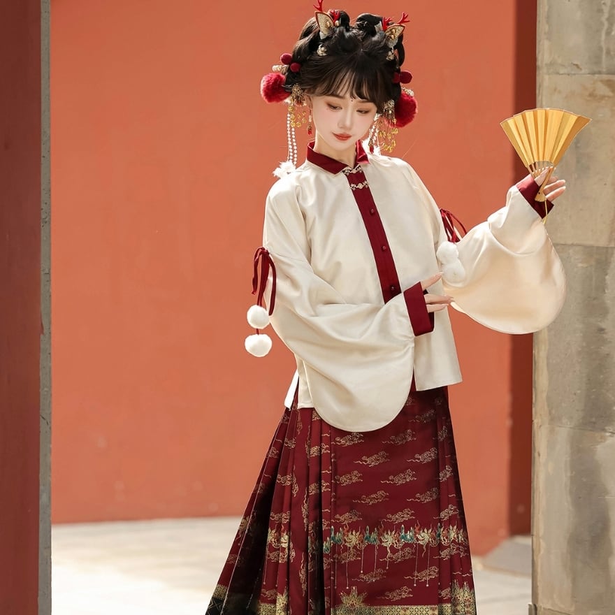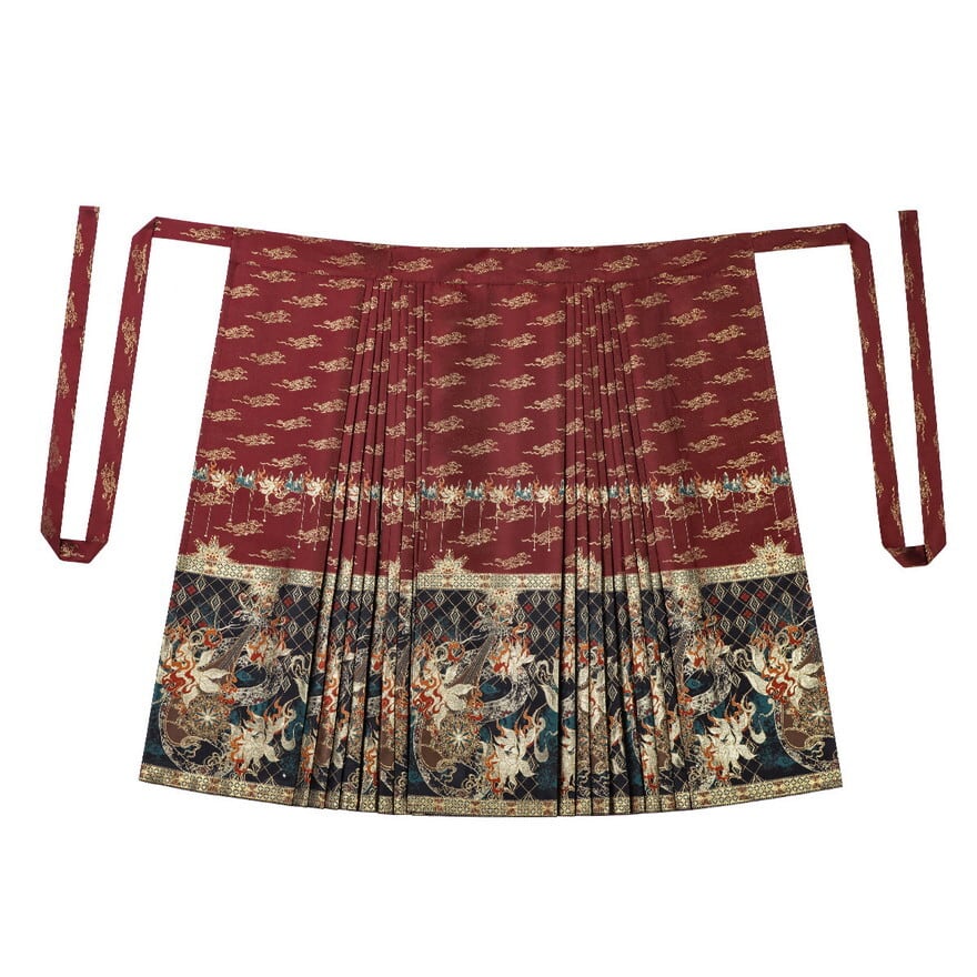 ロングスカート: ボルドーを基調に、裾部分に龍や唐草模様を思わせる緻密な中華風の柄がプリントされています。プリーツが縦のラインを強調し、優雅なロング丈でありながらスタイルアップを叶えます。