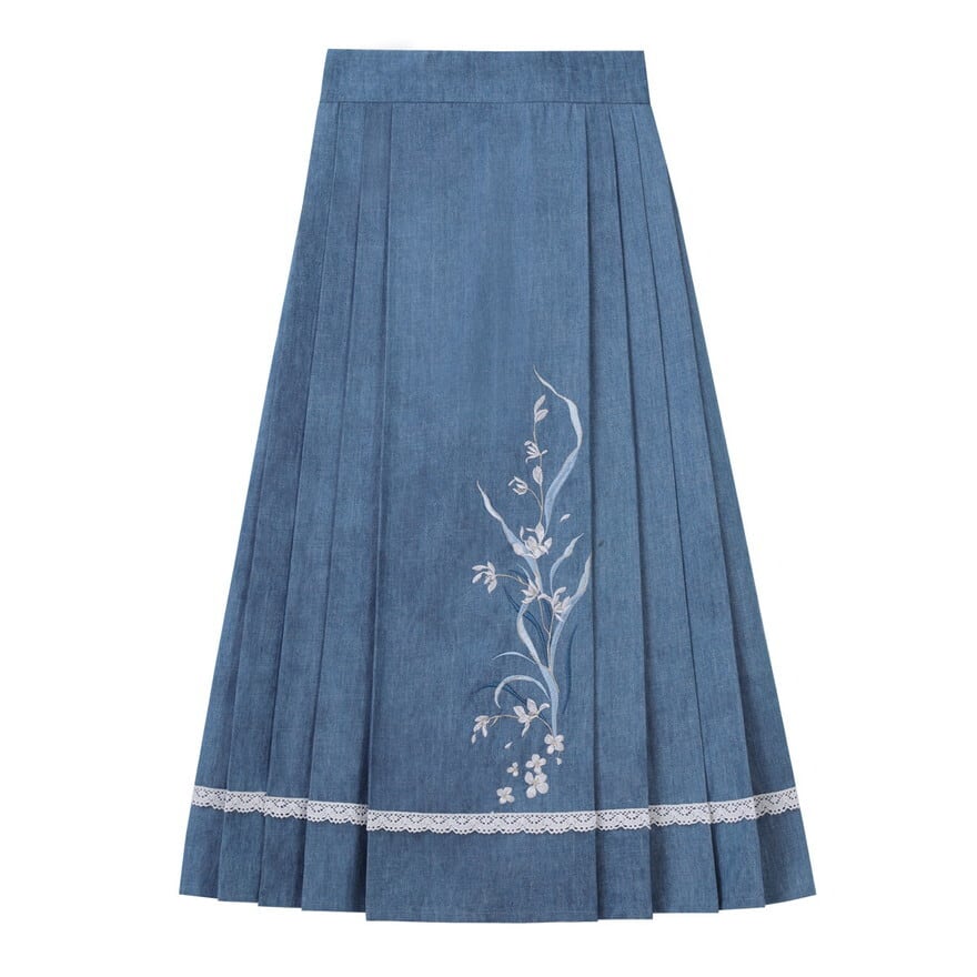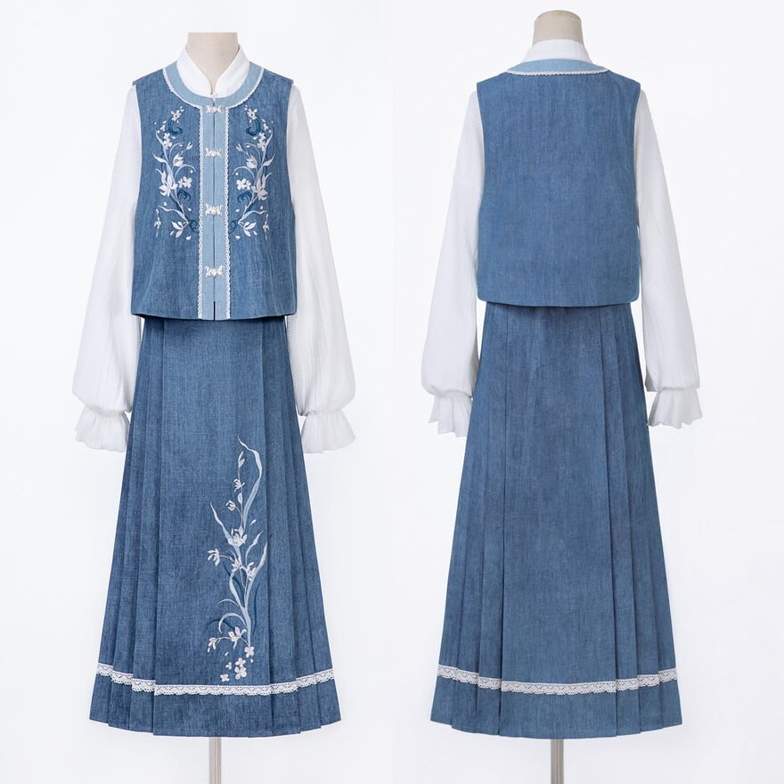 【クラシカルロリィタ】デニム風 刺繍 セットアップ 中華ロリータ ベスト スカート 3点セット