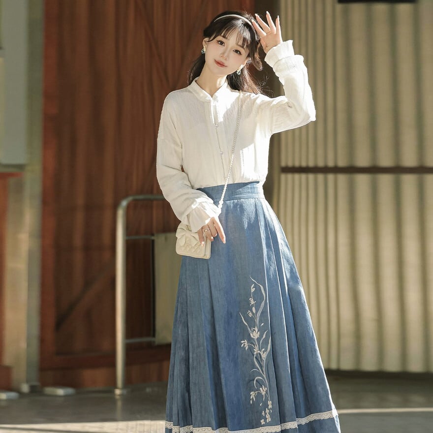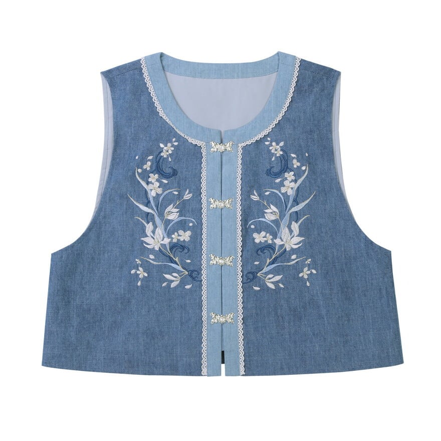 オリエンタルな魅力とロリータファッションの上品な可愛らしさが融合した、中華ロリータ(華ロリ)セットアップ。 カジュアルなデニム風素材を使用しつつ、繊細な白の花刺繍を施すことで、日常に溶け込むクラシカルな華ロリスタイルを実現しました。 ベストとロングスカートの2点セットは、それぞれ単体でも着回し力抜群。普段使いのロリータコーデを新鮮にアップデートしたい方におすすめです。
