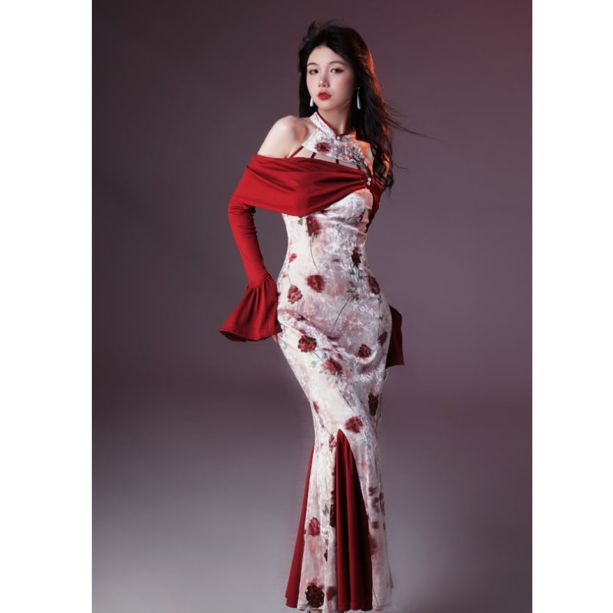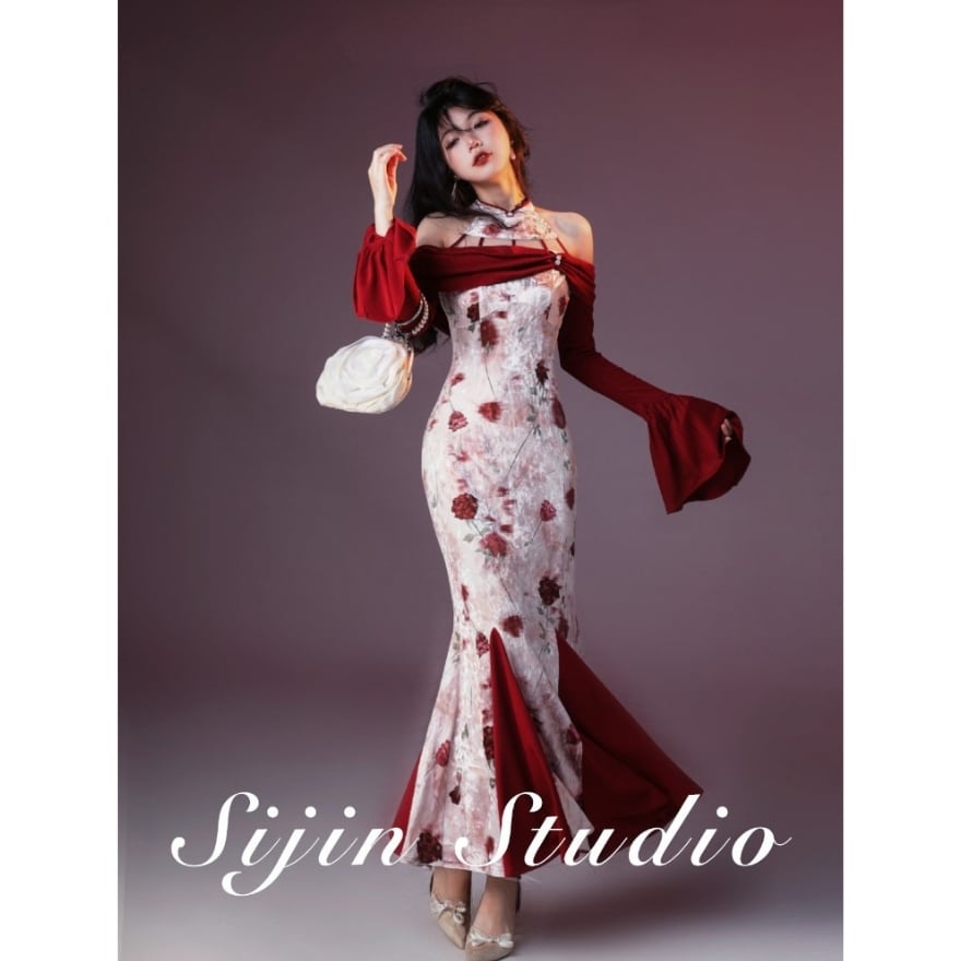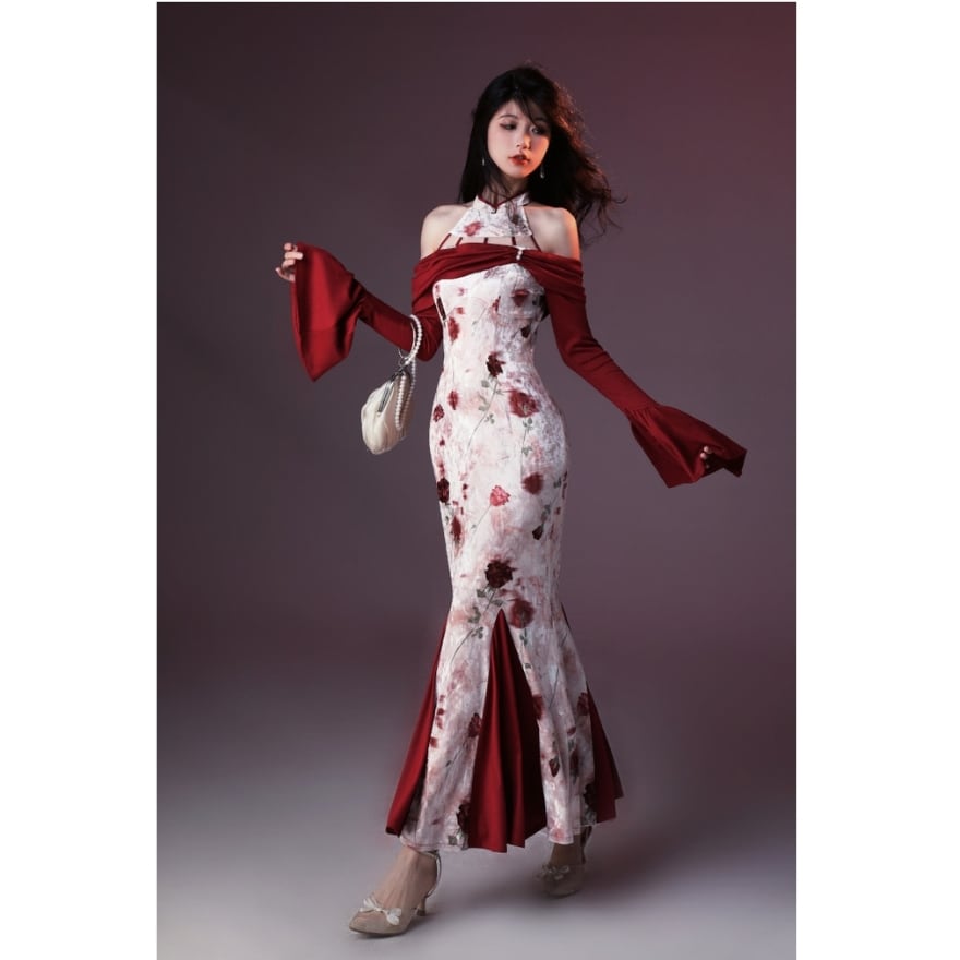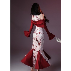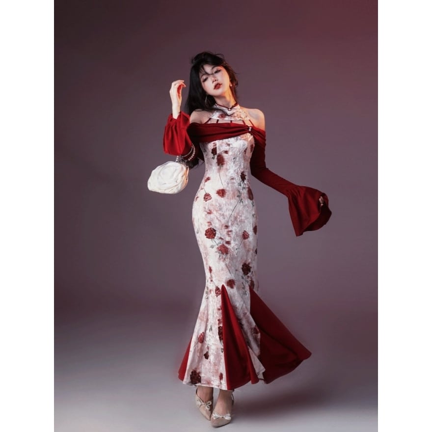 本商品は、落ち着いた花柄と縦ラインを活かしたマーメイドシルエットにより、