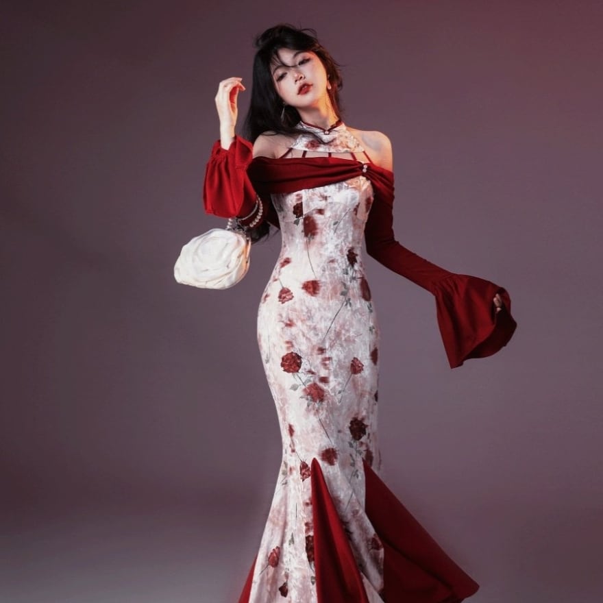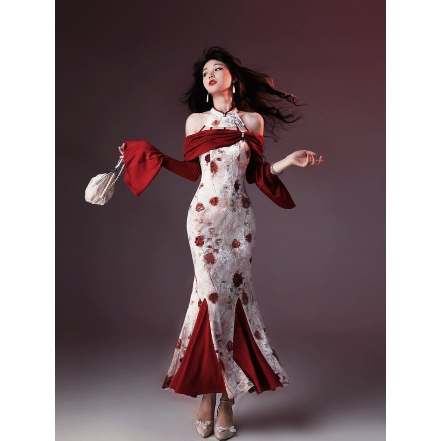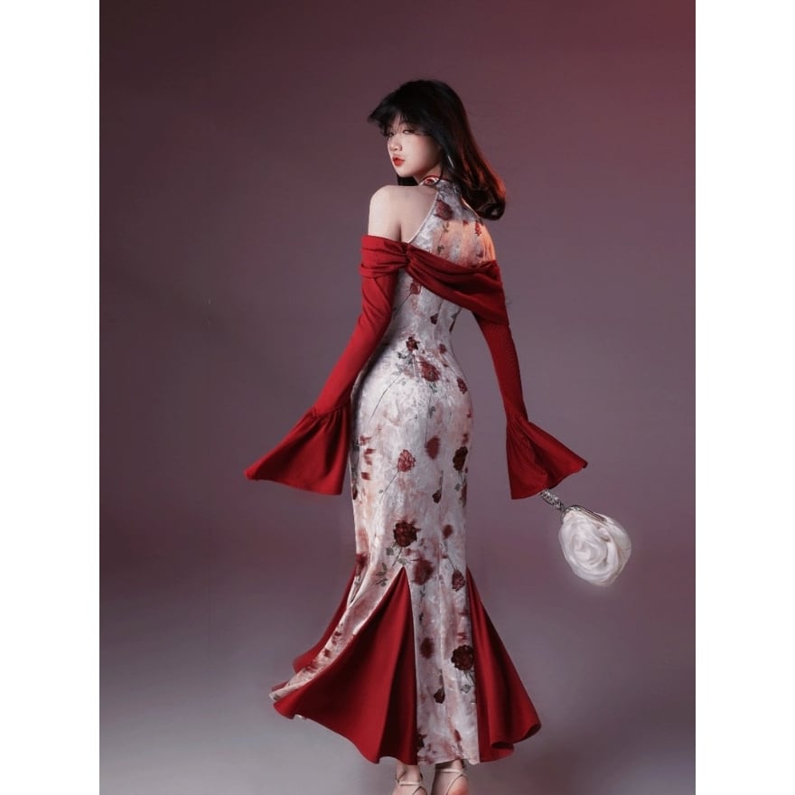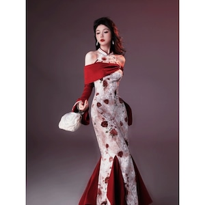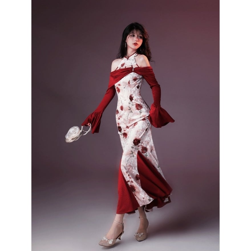 本商品は、落ち着いた花柄と縦ラインを活かしたマーメイドシルエットにより、