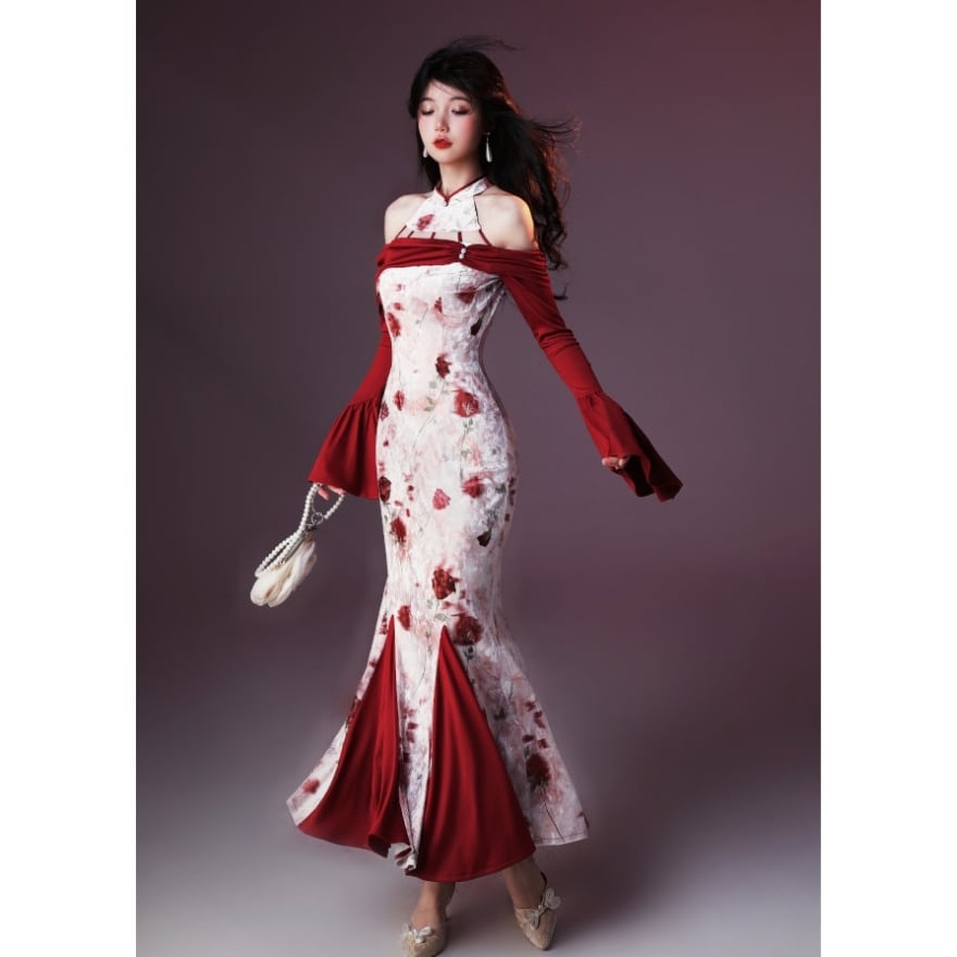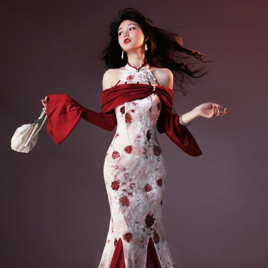 大人向け ゴスロリ中華風花柄ワンピース 上品マーメイドシルエット・控えめ華やか
