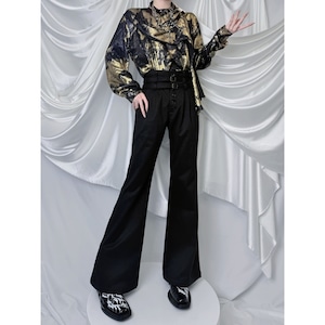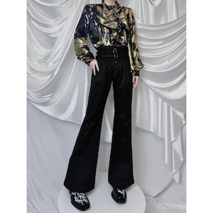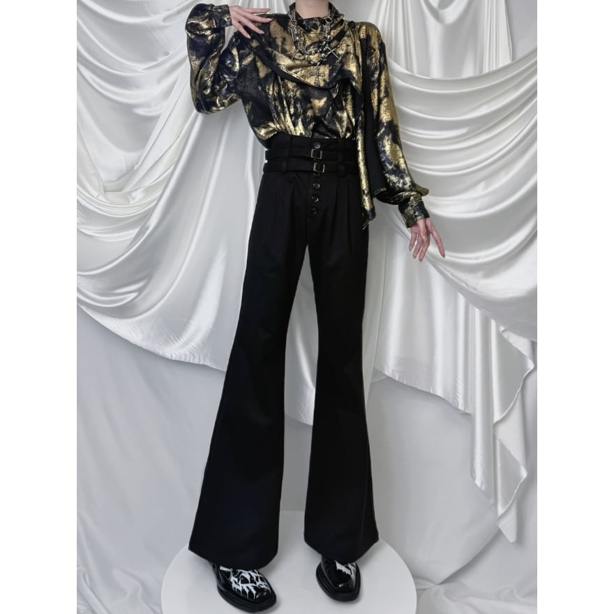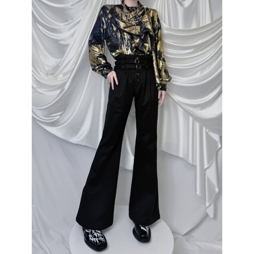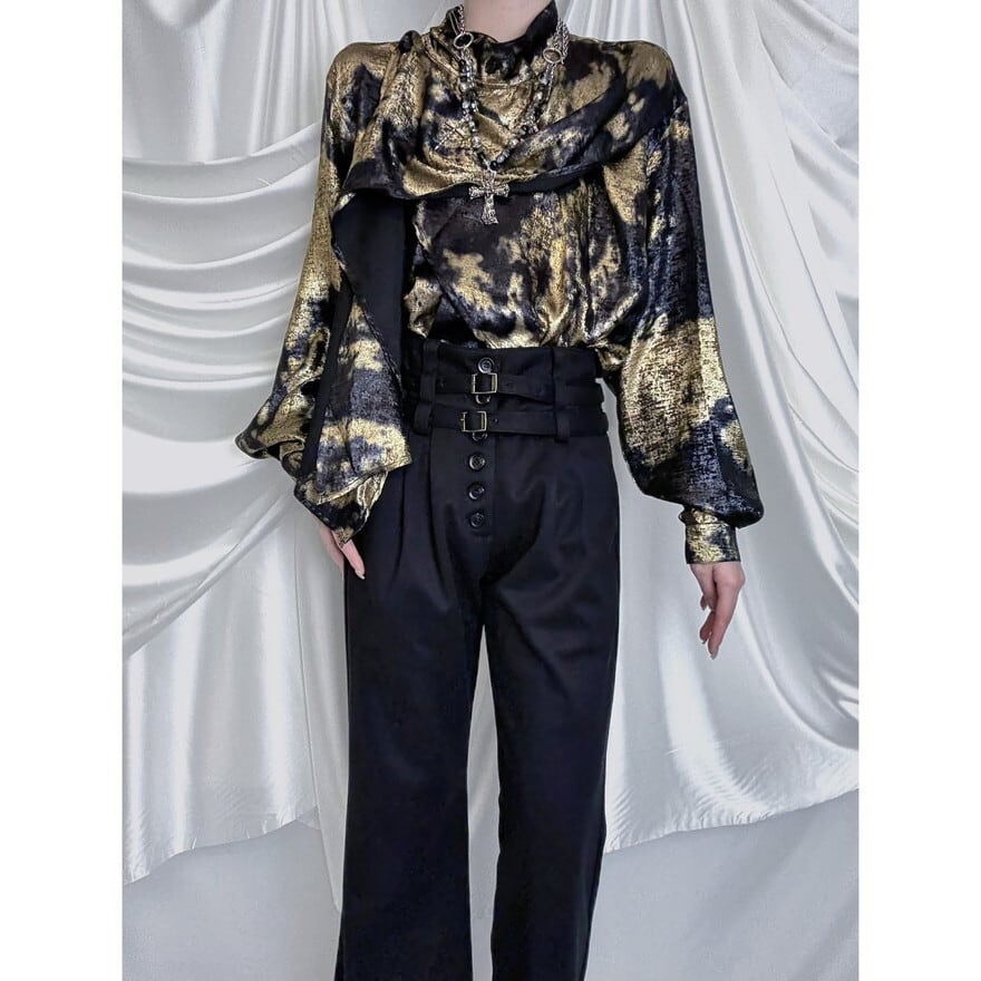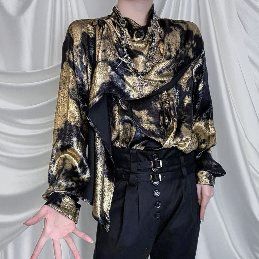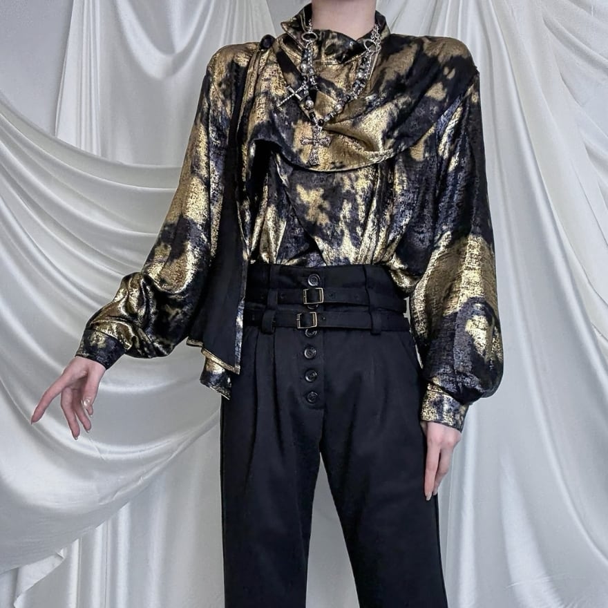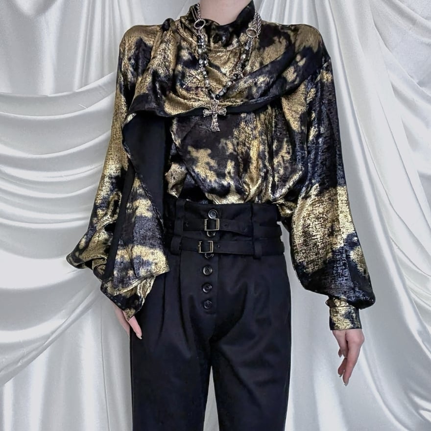 箔調の光沢と非対称ドレープが特徴の、大人向けゴシックブラウスです。