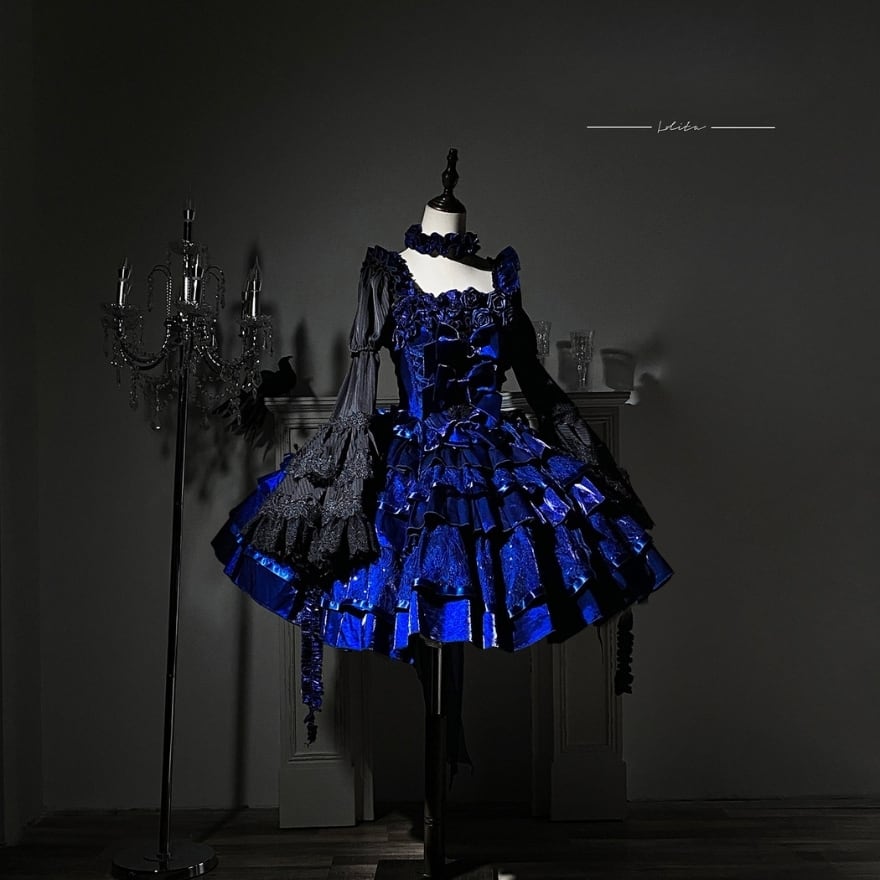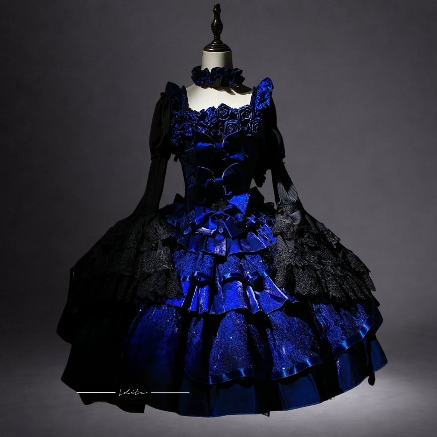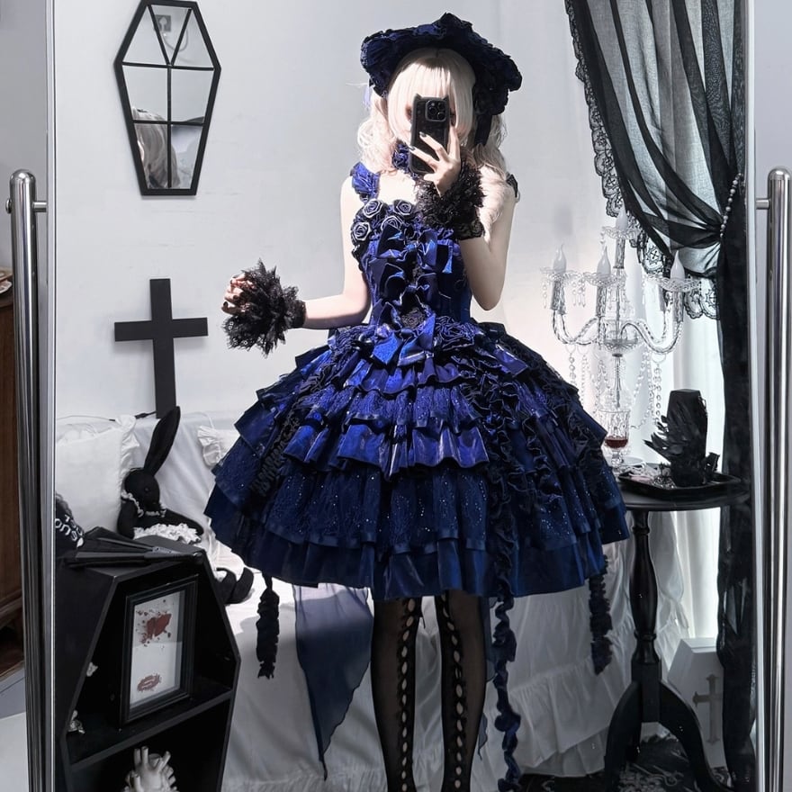 深海のような濃紺ブルーに、立体的な薔薇モチーフと多層フリルを重ねた、ゴシックロリィタのためのジャンパースカート。