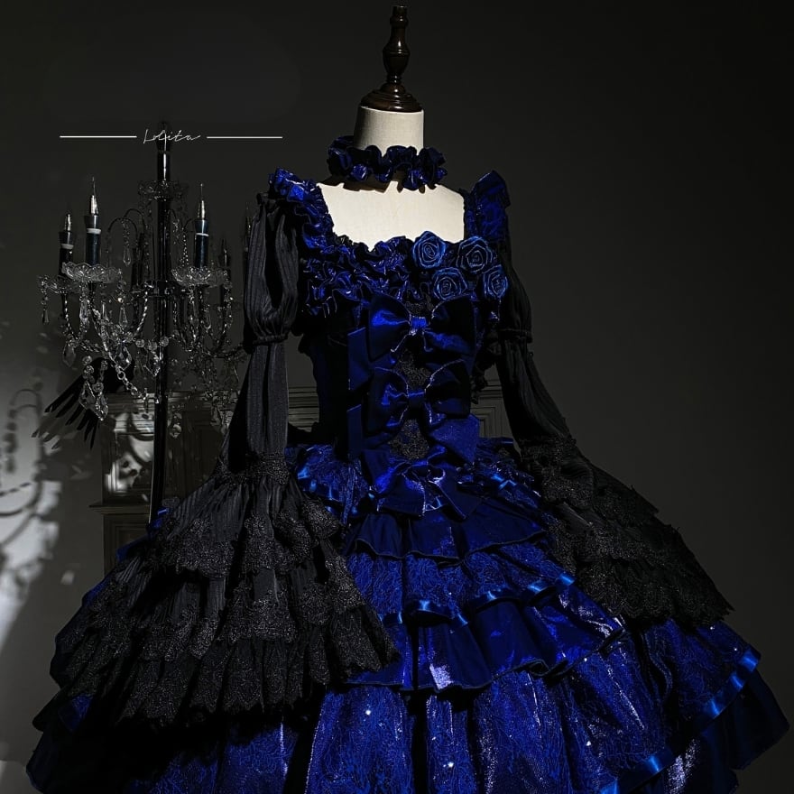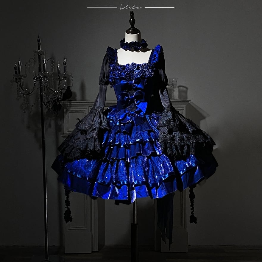 深いブルーに薔薇装飾を重ねた、重厚感あるゴシックロリィタJSK。受注生産のためご注文後に製作・発送となります。世界観を重視した特別な一着。