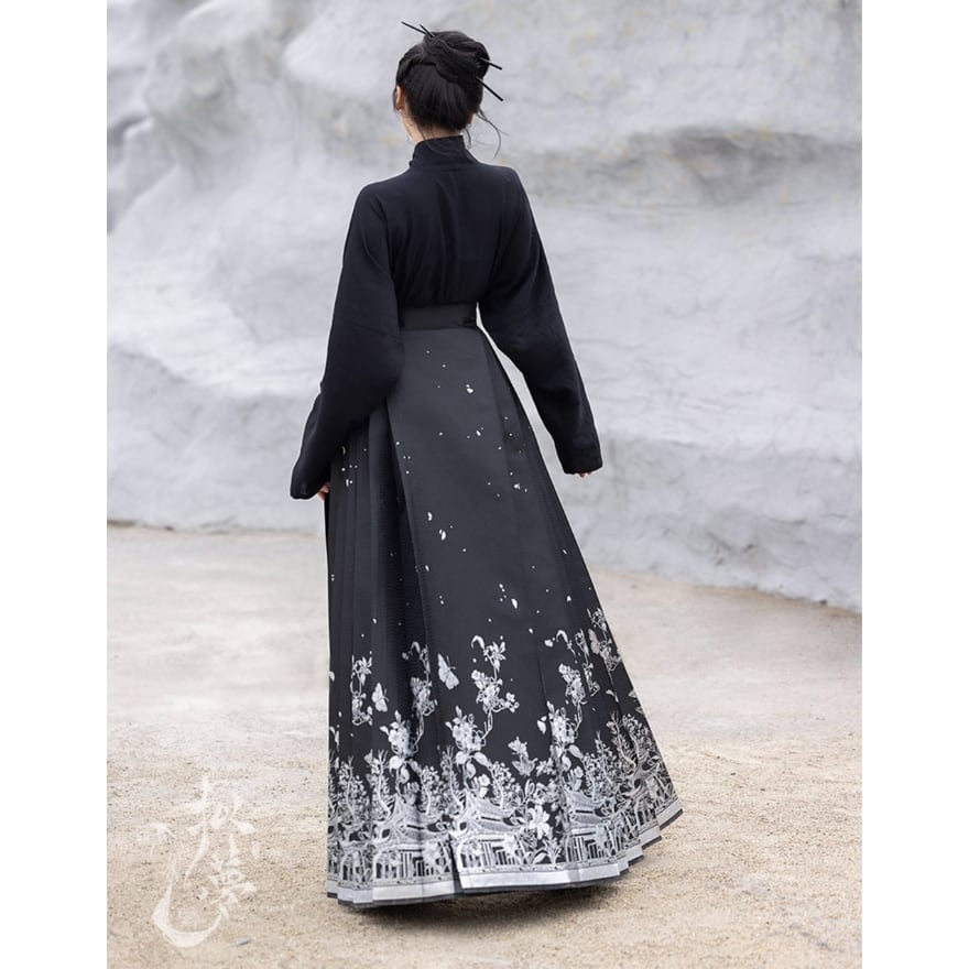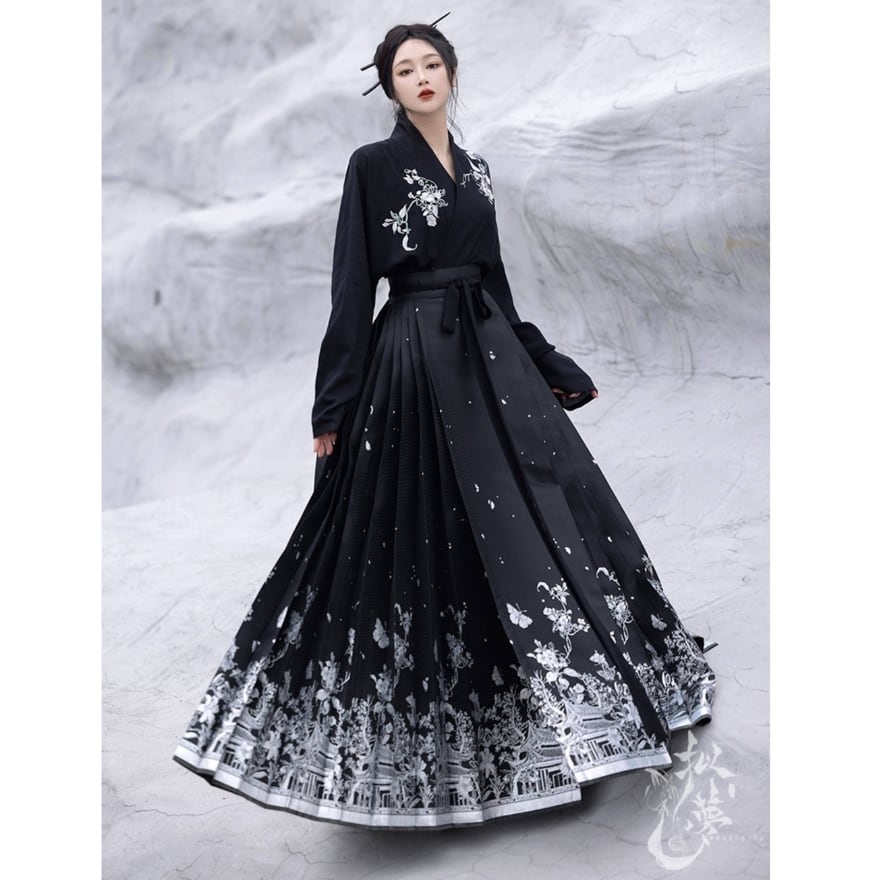 左右に配された飛鶴と草花刺繍が、控えめながらも印象的なアクセントとなり、和モダン・中華ゴシックの雰囲気を演出します。