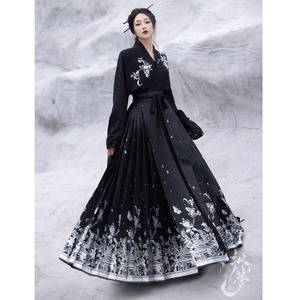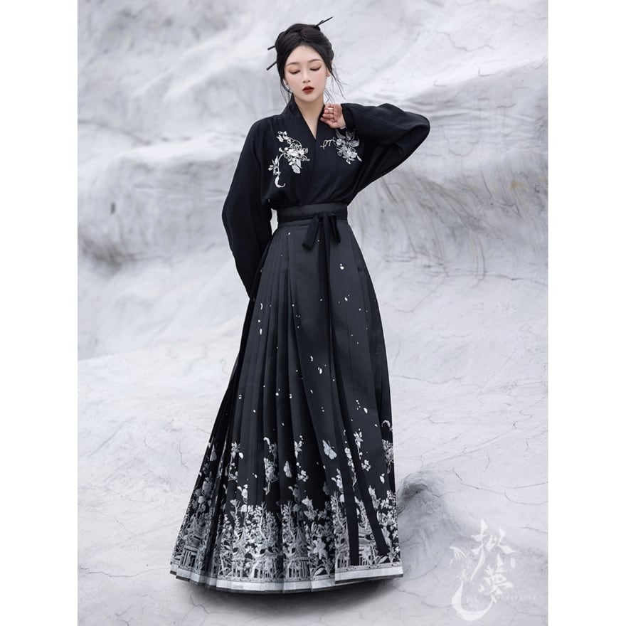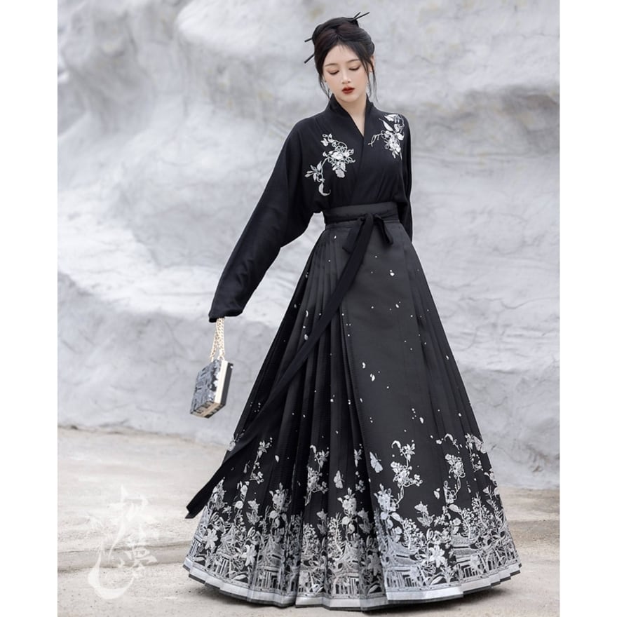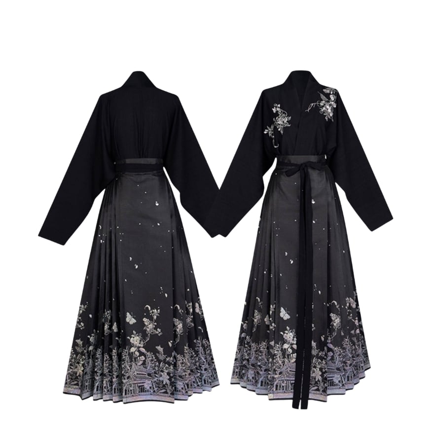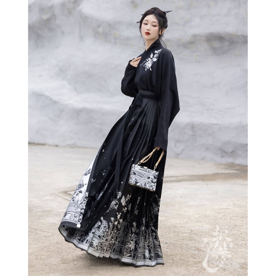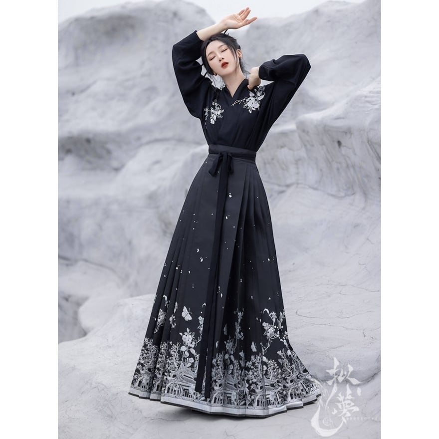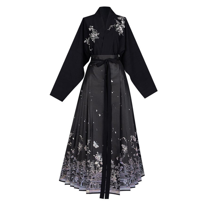 中華ゴシック 花蝶刺繍 プリーツロングスカート 和モダン ブラック