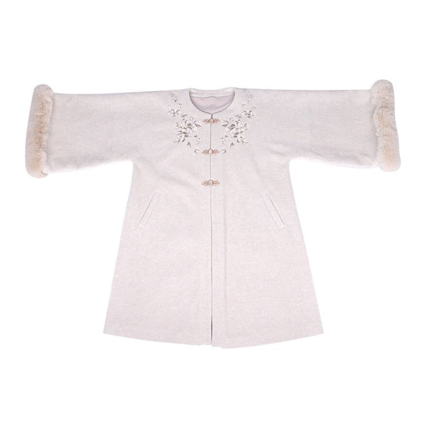 刺繍入りロングコートは、ゆったりとした中式シルエットで体型を拾いにくく、重ね着しても動きやすい設計。