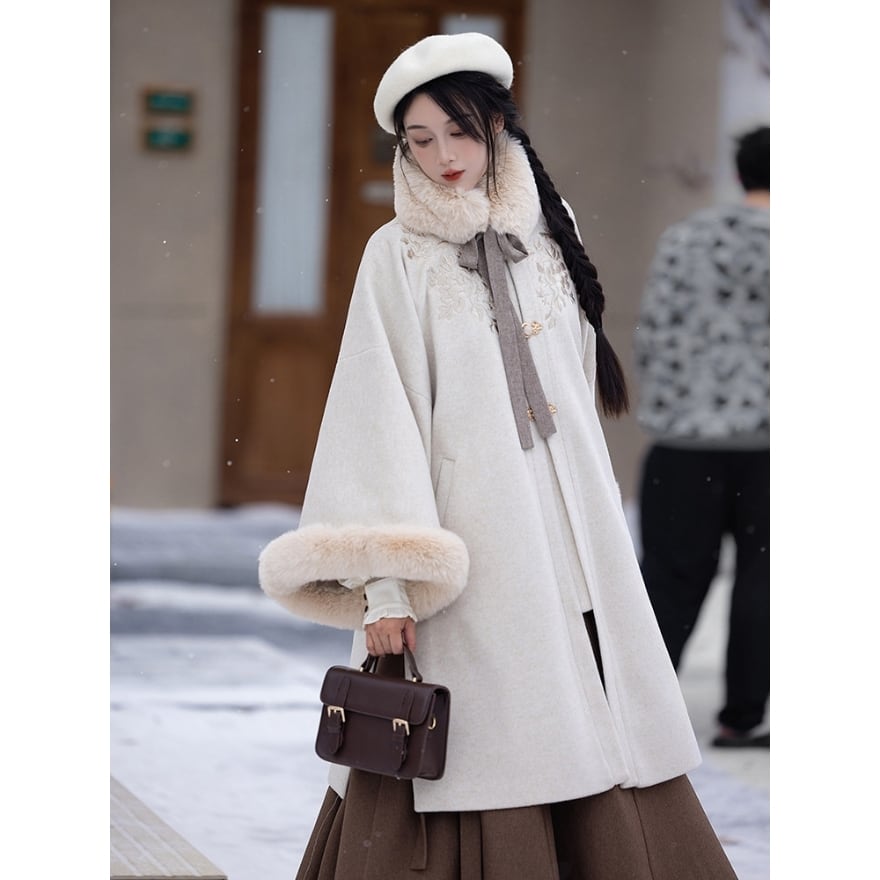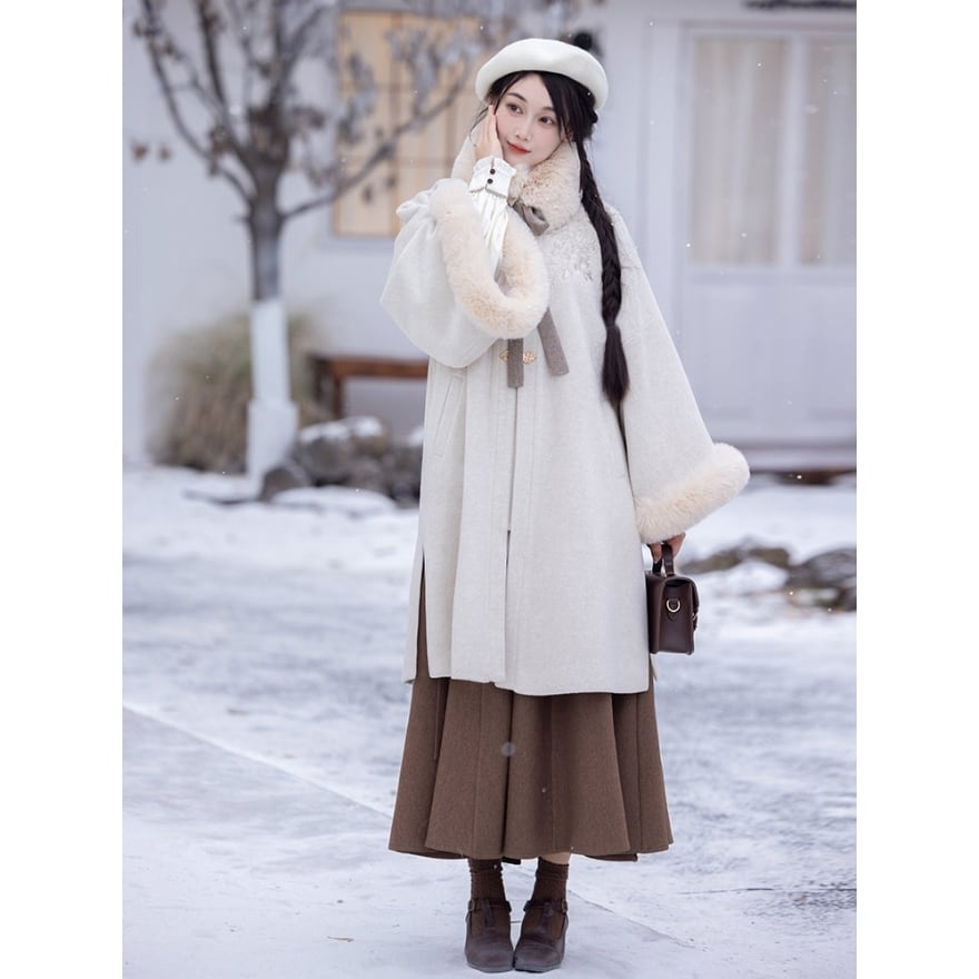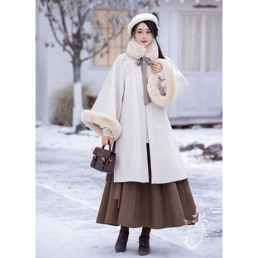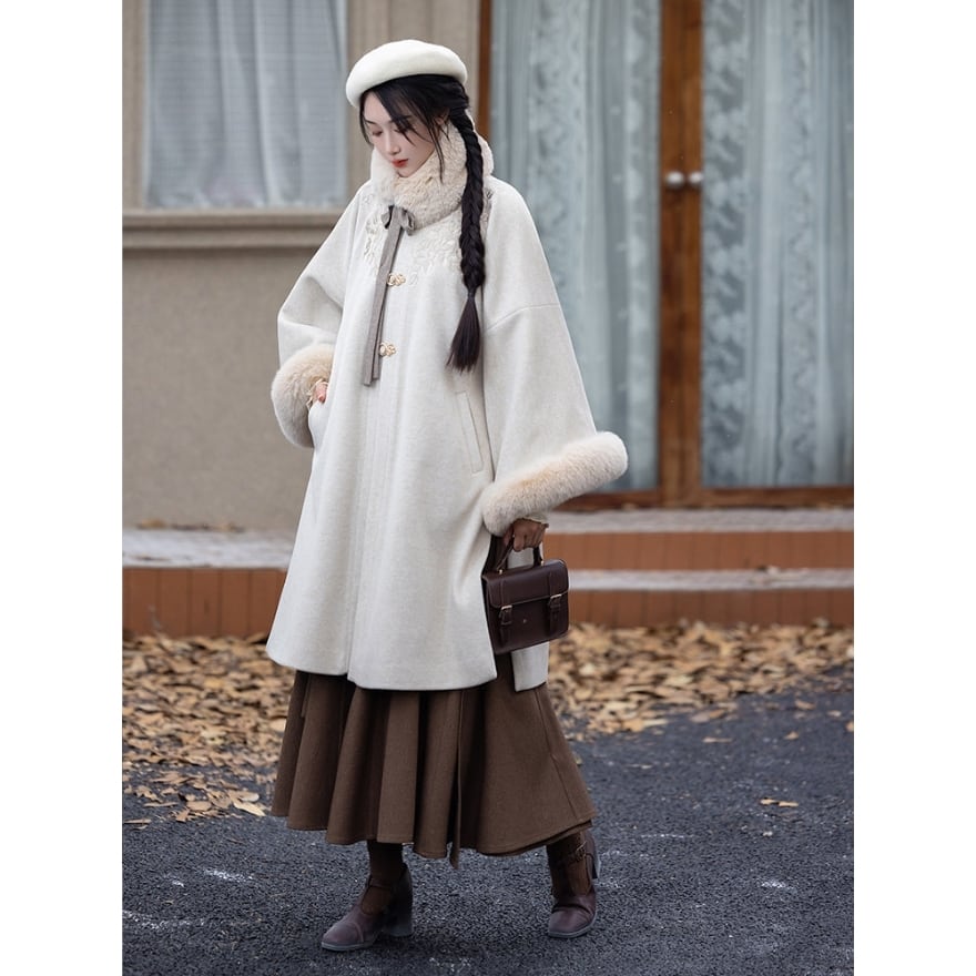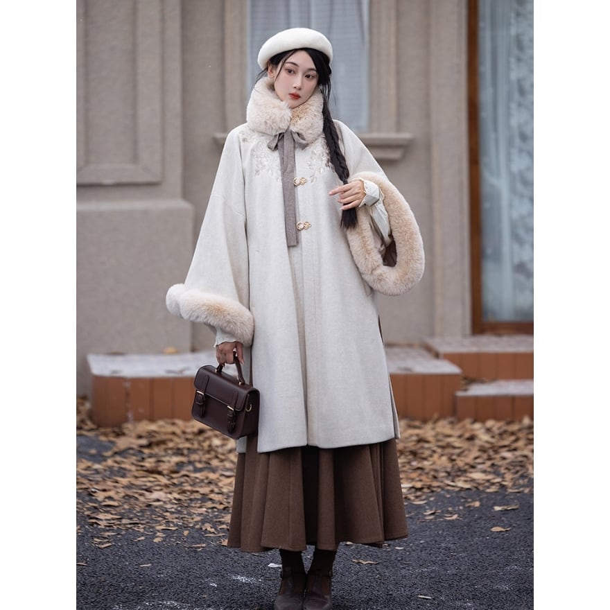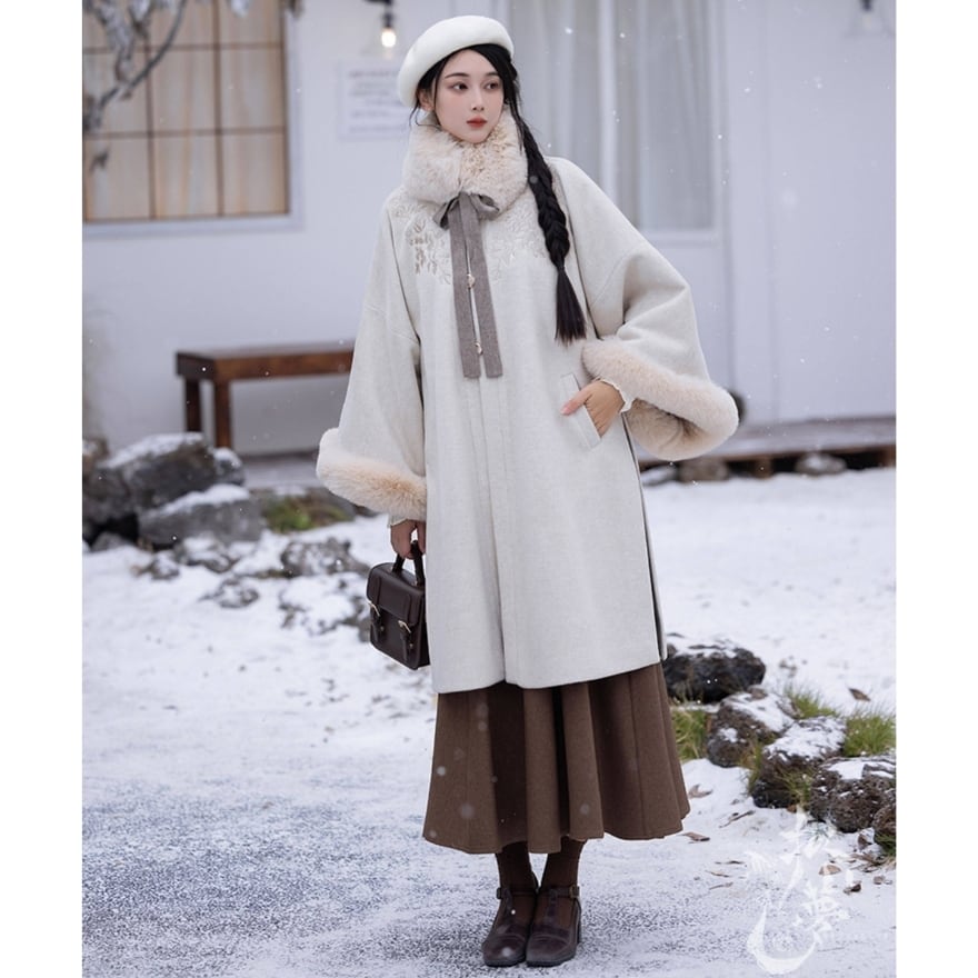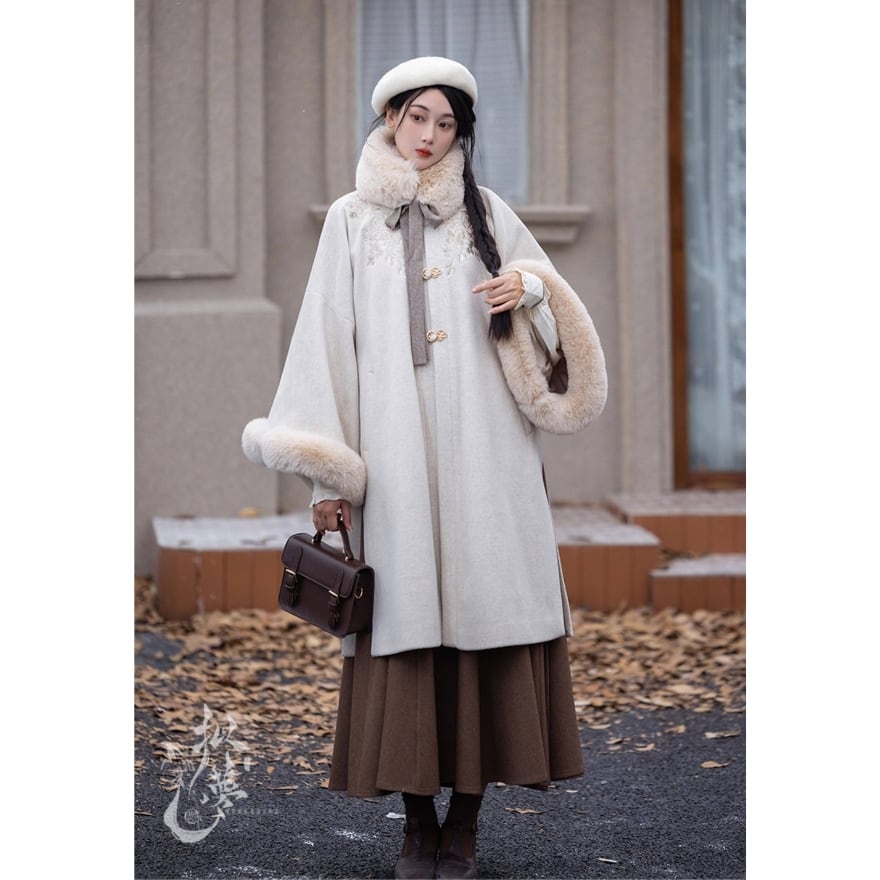 中華風ロリータ 3点セットアップ|防寒と重ね着に悩む冬向け・刺繍コート×プリーツスカート×フェイクファー付け襟