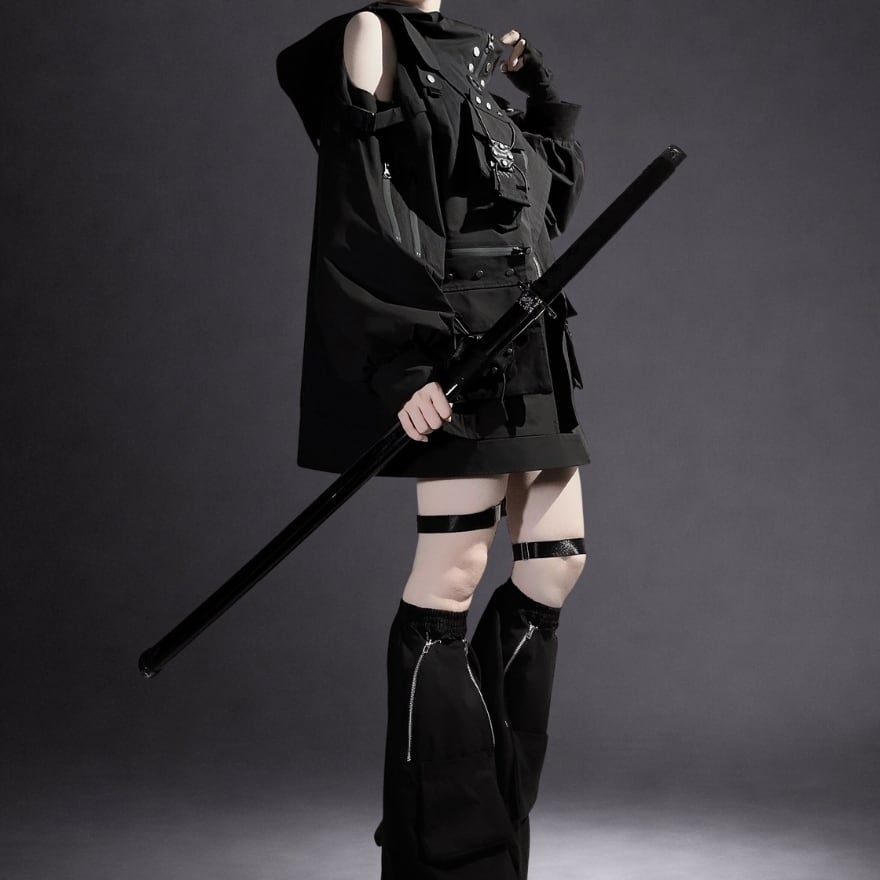 無機質な黒に機能美を宿したサイバーパンク系3点セットアップ。