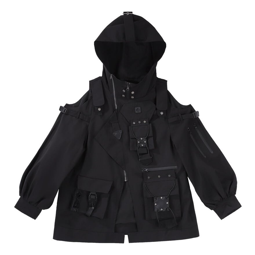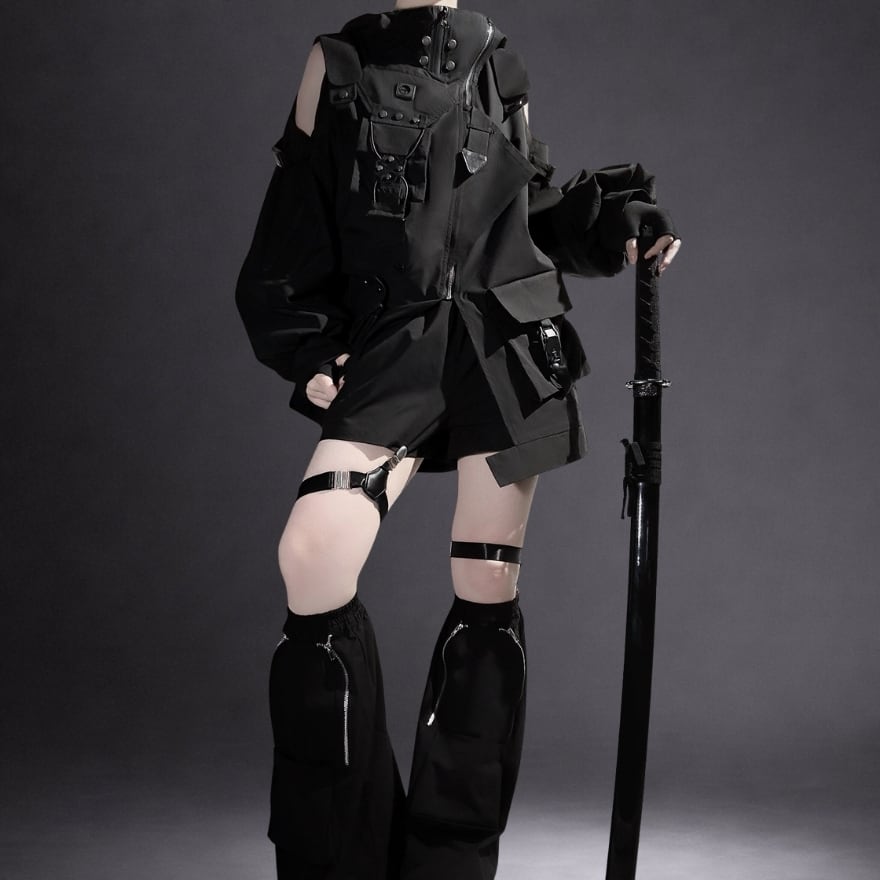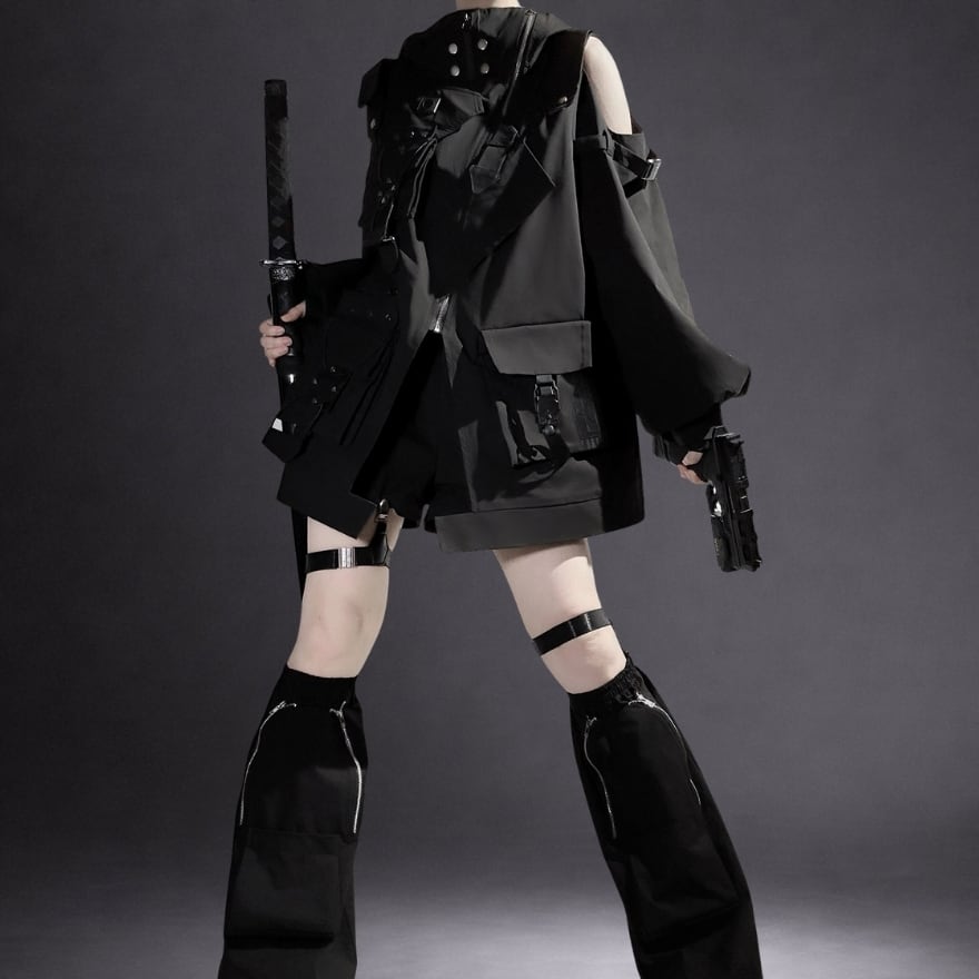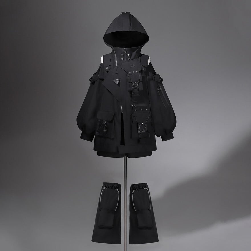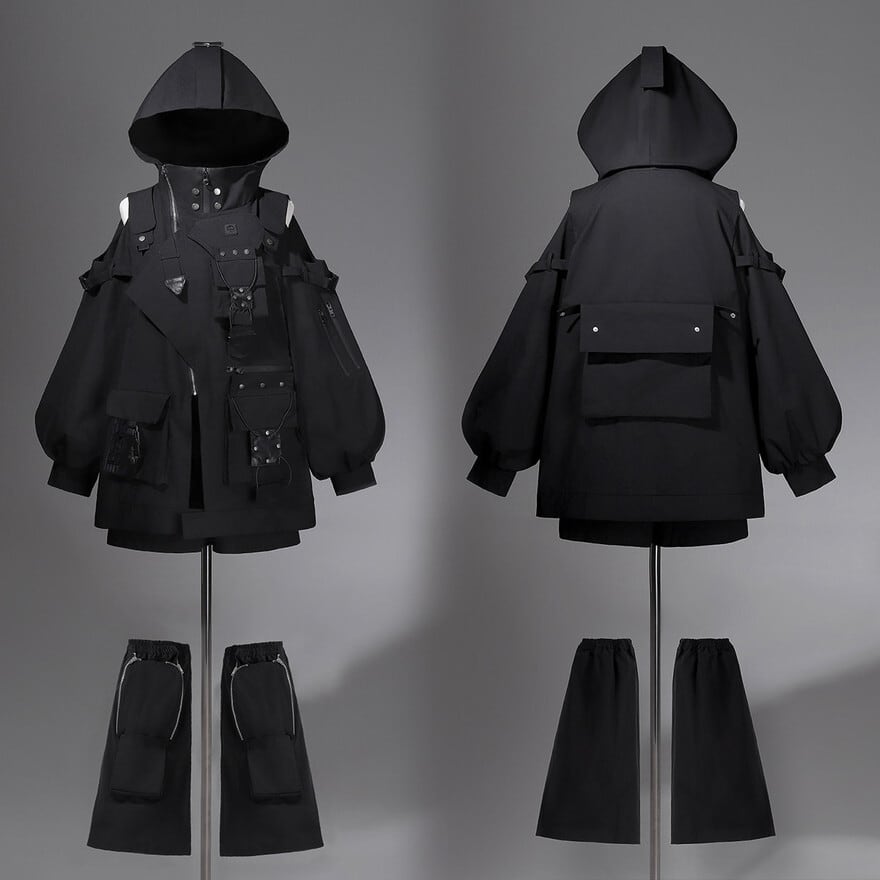 サイバーパンク フード付き多機能セットアップ 3点構成 ブラック ユニセックス 近未来 電脳コーデ
