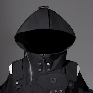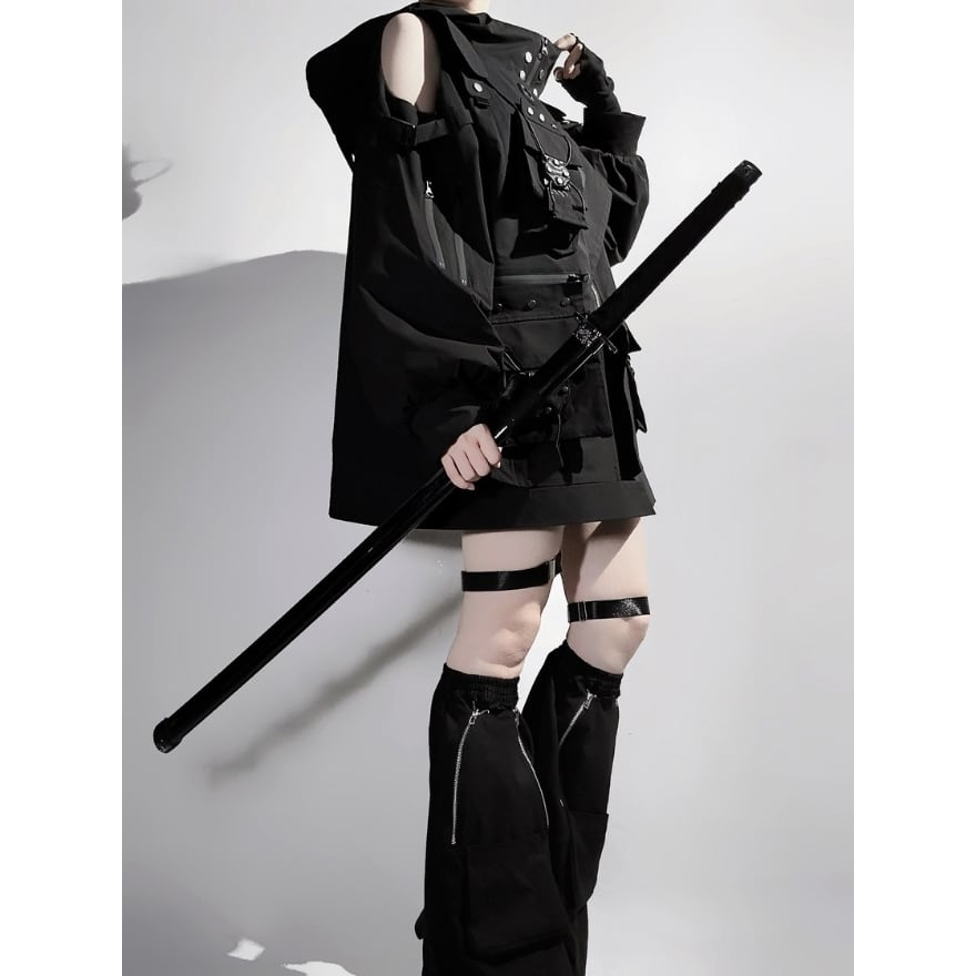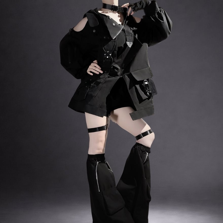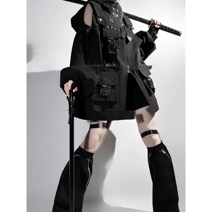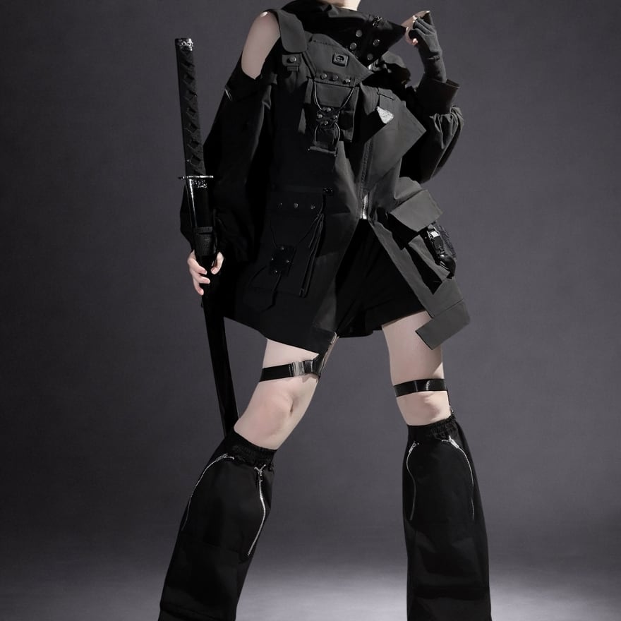 サイバーパンク フード付き多機能セットアップ 3点構成 ブラック ユニセックス 近未来 電脳コーデ