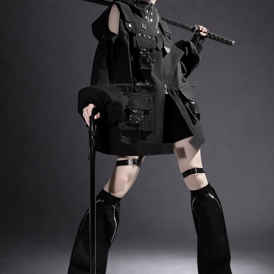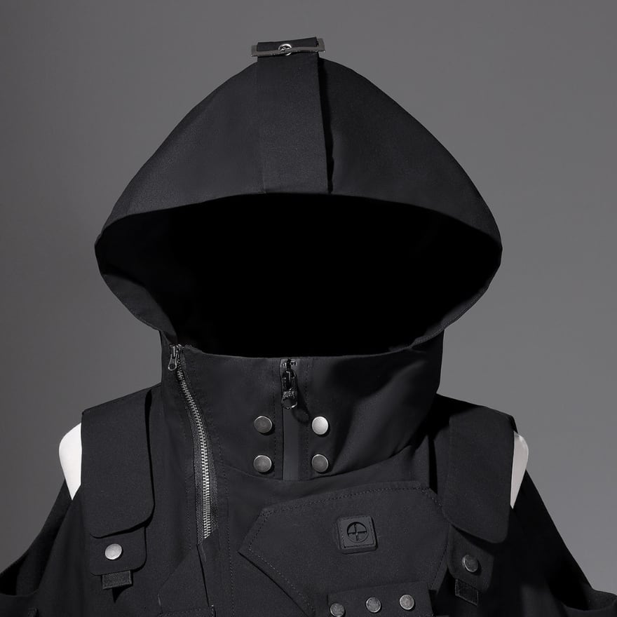 アウターはフード一体型デザインに多層ポケット、ベルト、バックルを配置し、機能性と攻撃的なシルエットを両立。