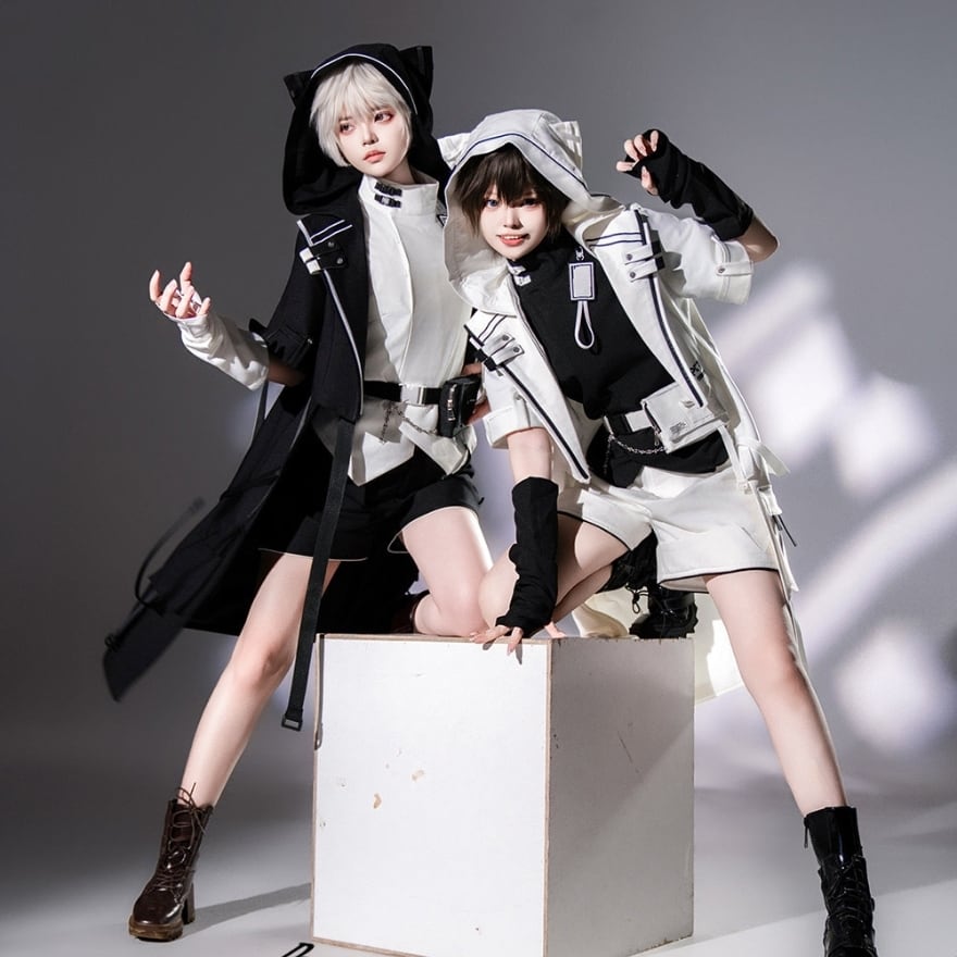 猫耳付きフード、アシンメトリーなベルト配置、立体ポケットなど、機能美を意識した構造が特徴です。