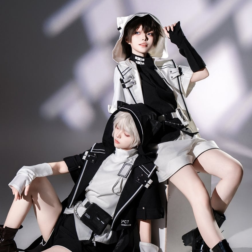 無機質なブラックに機能美を凝縮したサイバーパンク系トップスです。