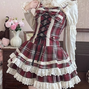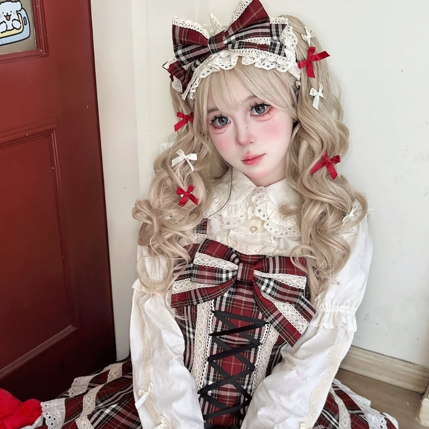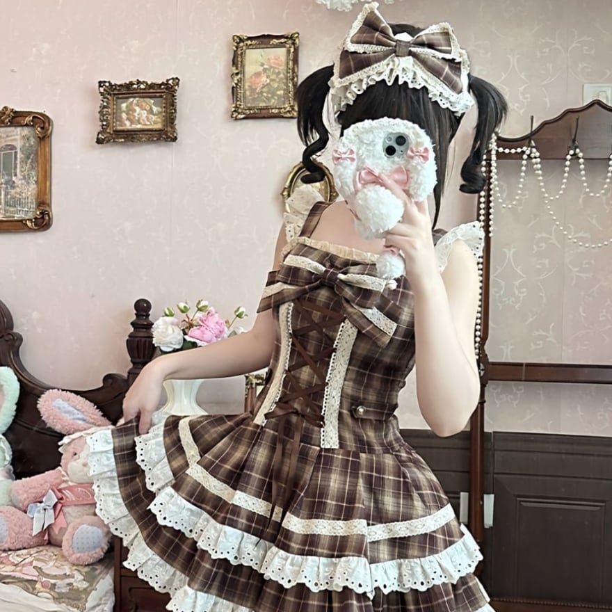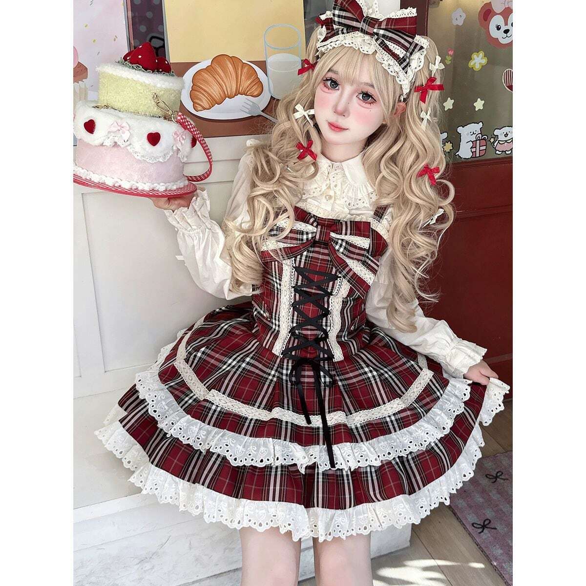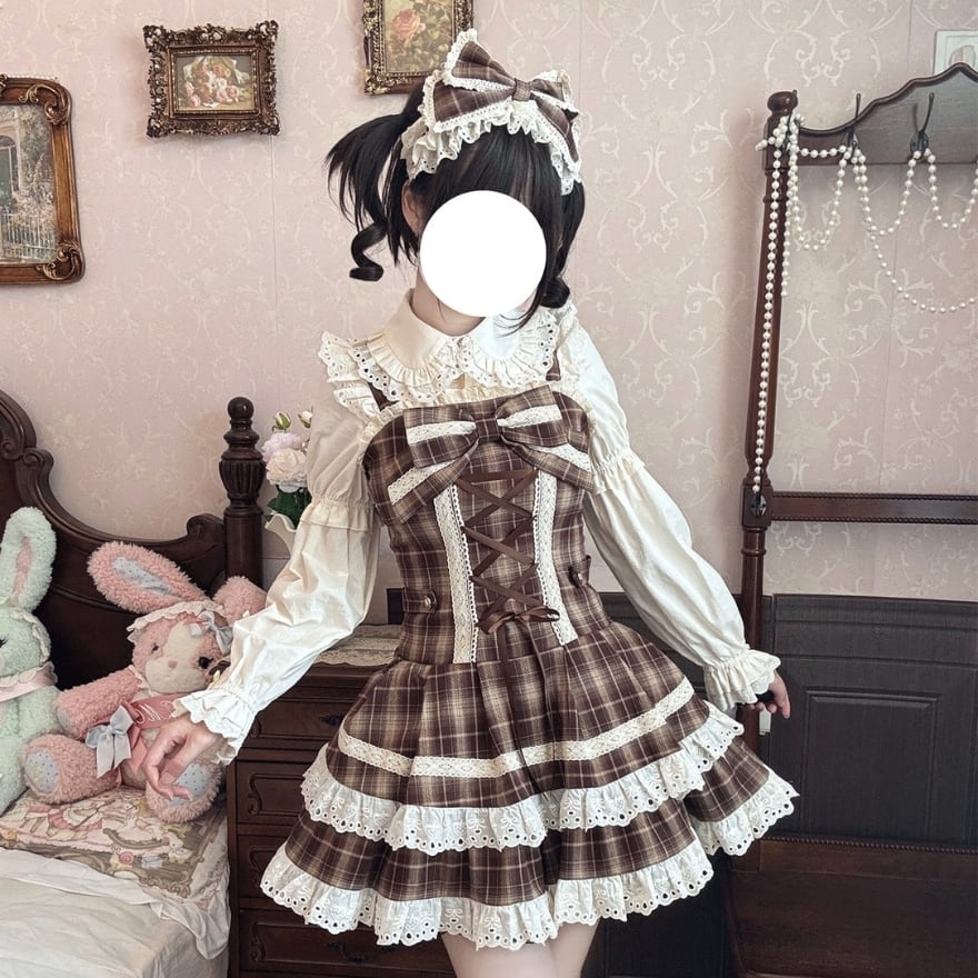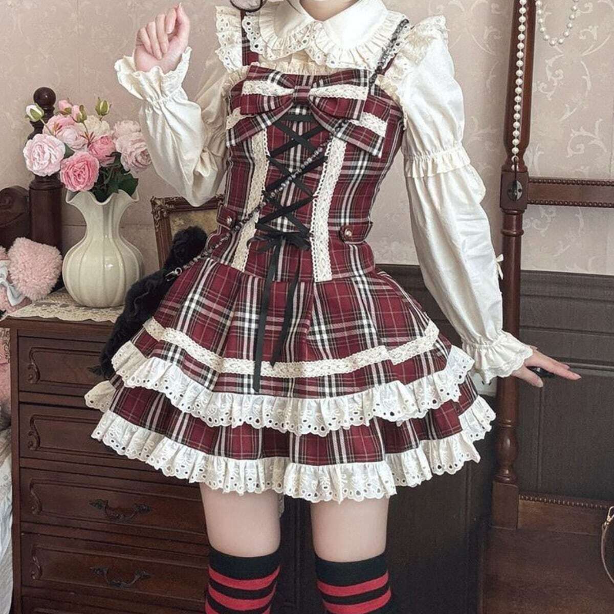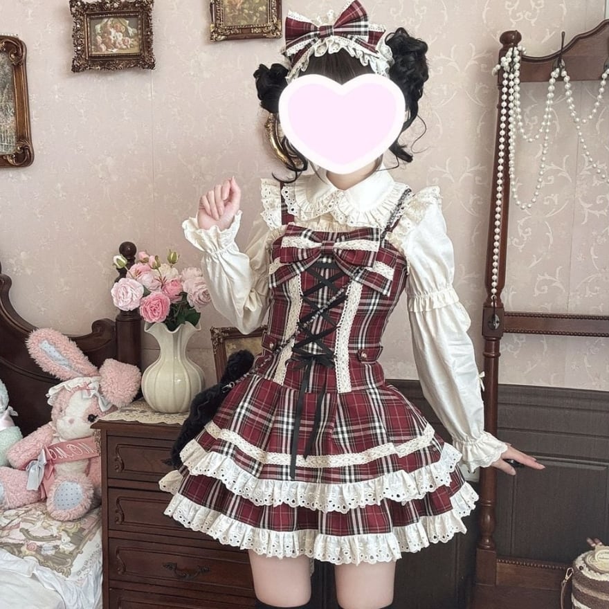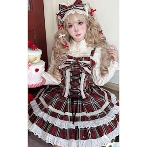 【地雷系量産型 / 甘ロリ】クラシカルチェック柄リボンJSK – レース×編み上げの細見えシルエット / 秋冬ガーリー / 推し活・デート