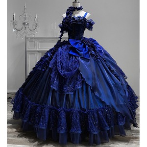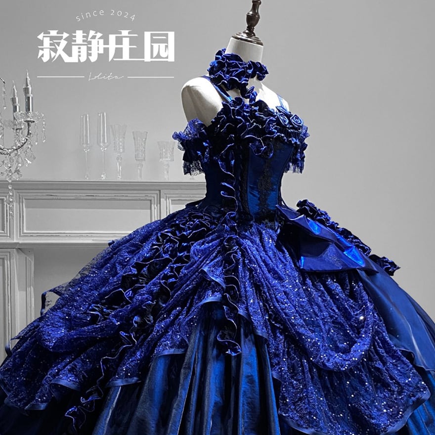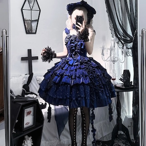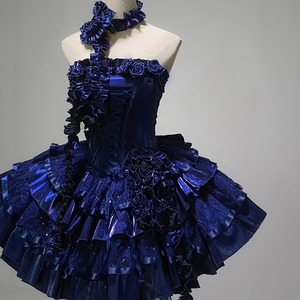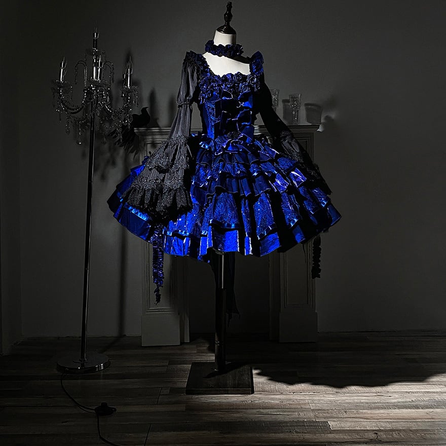 深く鮮やかなブルーと、闇を象徴するブラックが織りなす、荘厳なゴシックロリータのセットアップです。