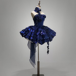 胸元とスカートに贅沢にあしらわれた青薔薇のモチーフと、重なり合う幾重ものフリルが、夜の蝶のように幻想的な美しさを放ちます。