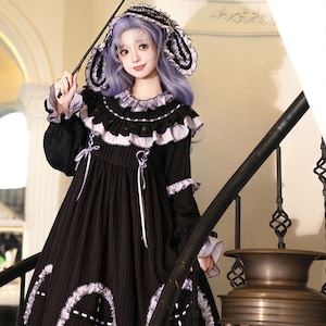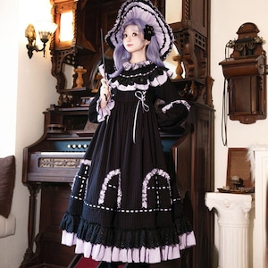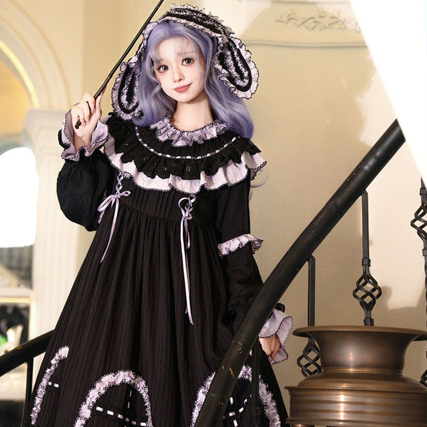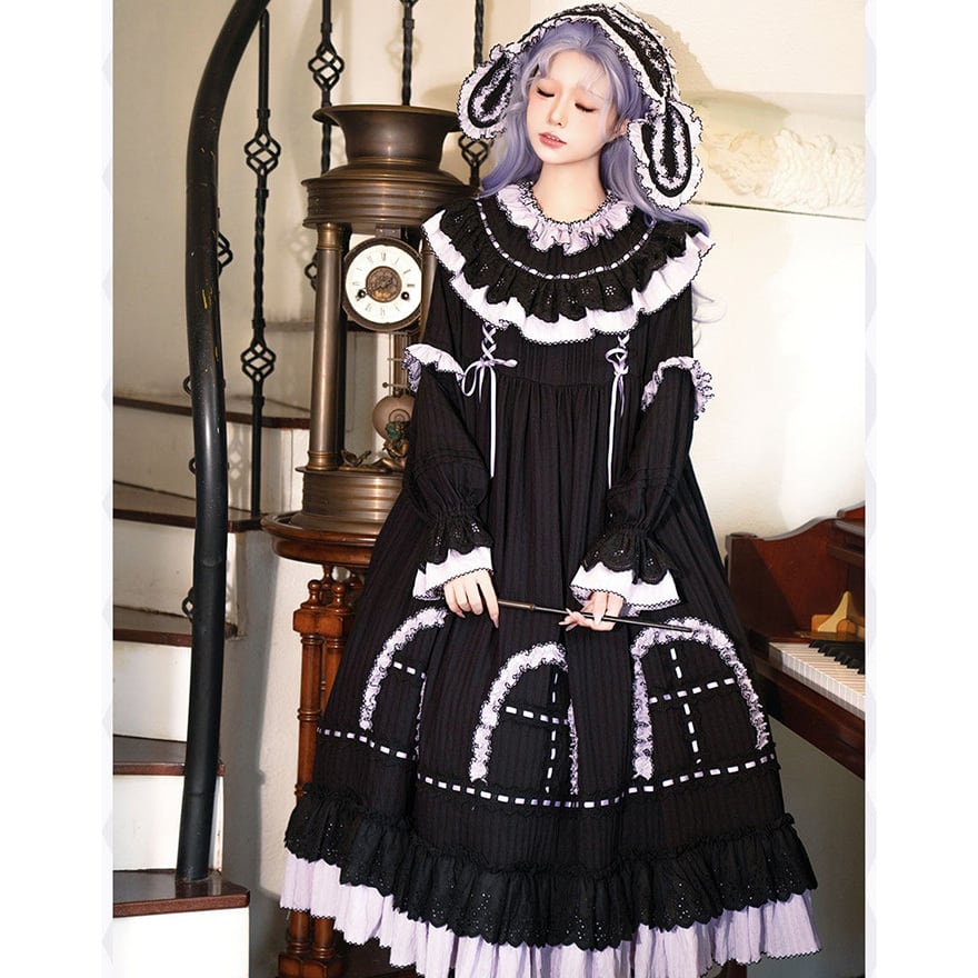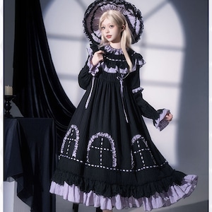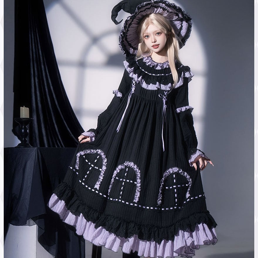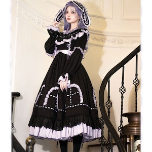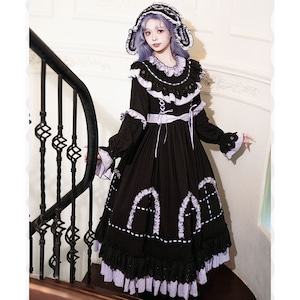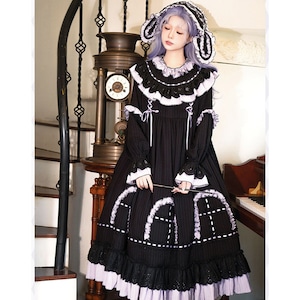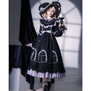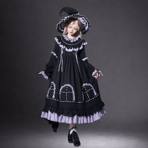 漆黒の生地に淡いラベンダーのフリルが美しく映える、ミステリアスな魔女風ロリータワンピースです。