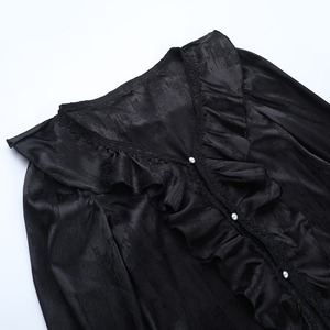Vネックの襟元からフロントにかけてあしらわれたボリュームのあるフリルと、上品に輝くパールのボタンが、ダークな中に高貴な華やかさを添えています。
