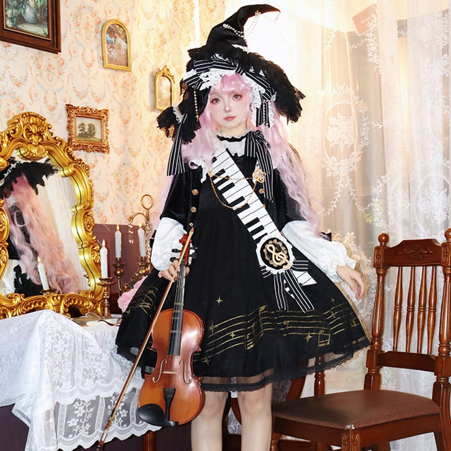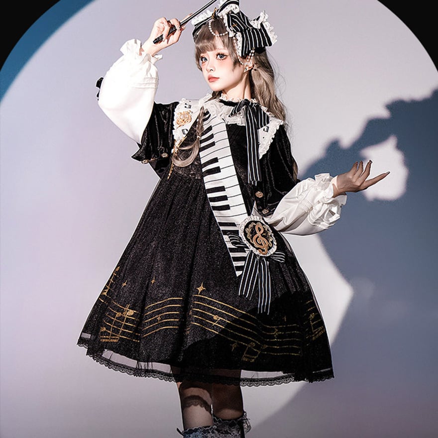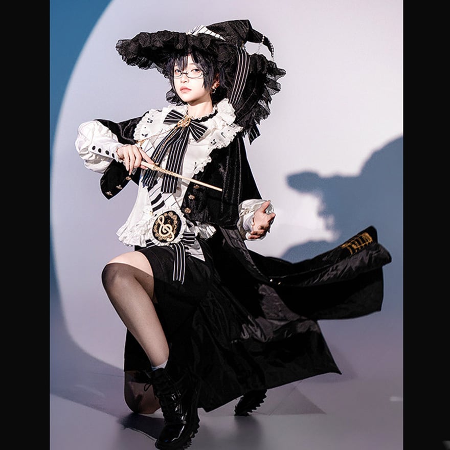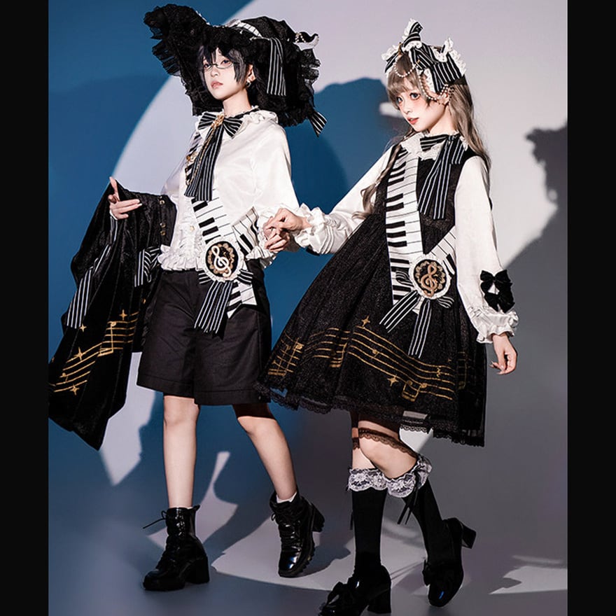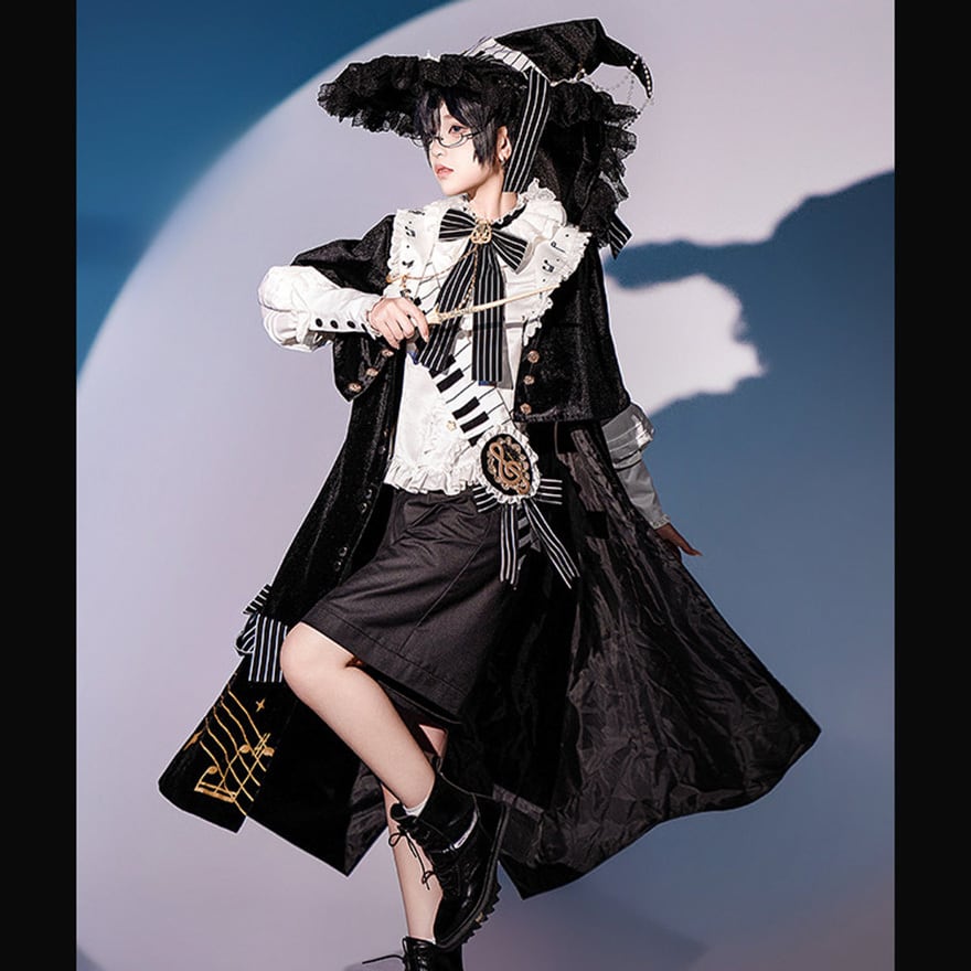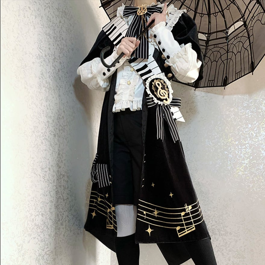 黒と白のコントラストを基調に、五線譜やピアノの鍵盤モチーフを随所にあしらった、芸術的でミステリアスな王子系セットアップです。