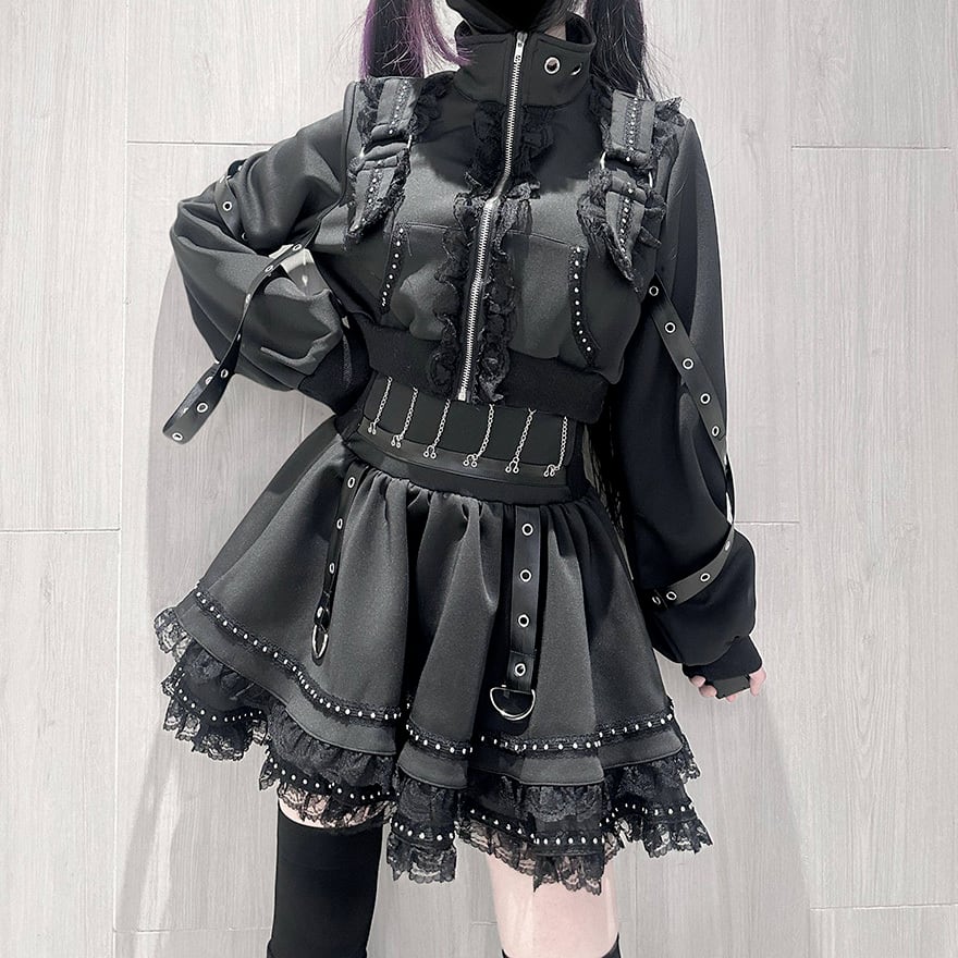 スタッズやハトメの金属的な質感と、レースやフリルの甘さが絶妙にミックスされた、唯一無二の存在感を放つ一着。